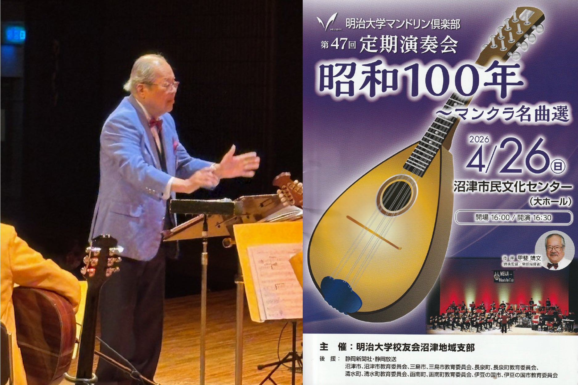昨日は沼津市民文化センターで明治大学マンドリン倶楽部の演奏会が開催されました。マンドリン倶楽部は全国にある明治大学校友会(卒業生の同窓会組織)の地域支部の皆さまから招聘され、各地で演奏活動を行っています。この日は毎年主催いただいている「明治大学校友会沼津地域支部」様のご協力により本プロジェクト...