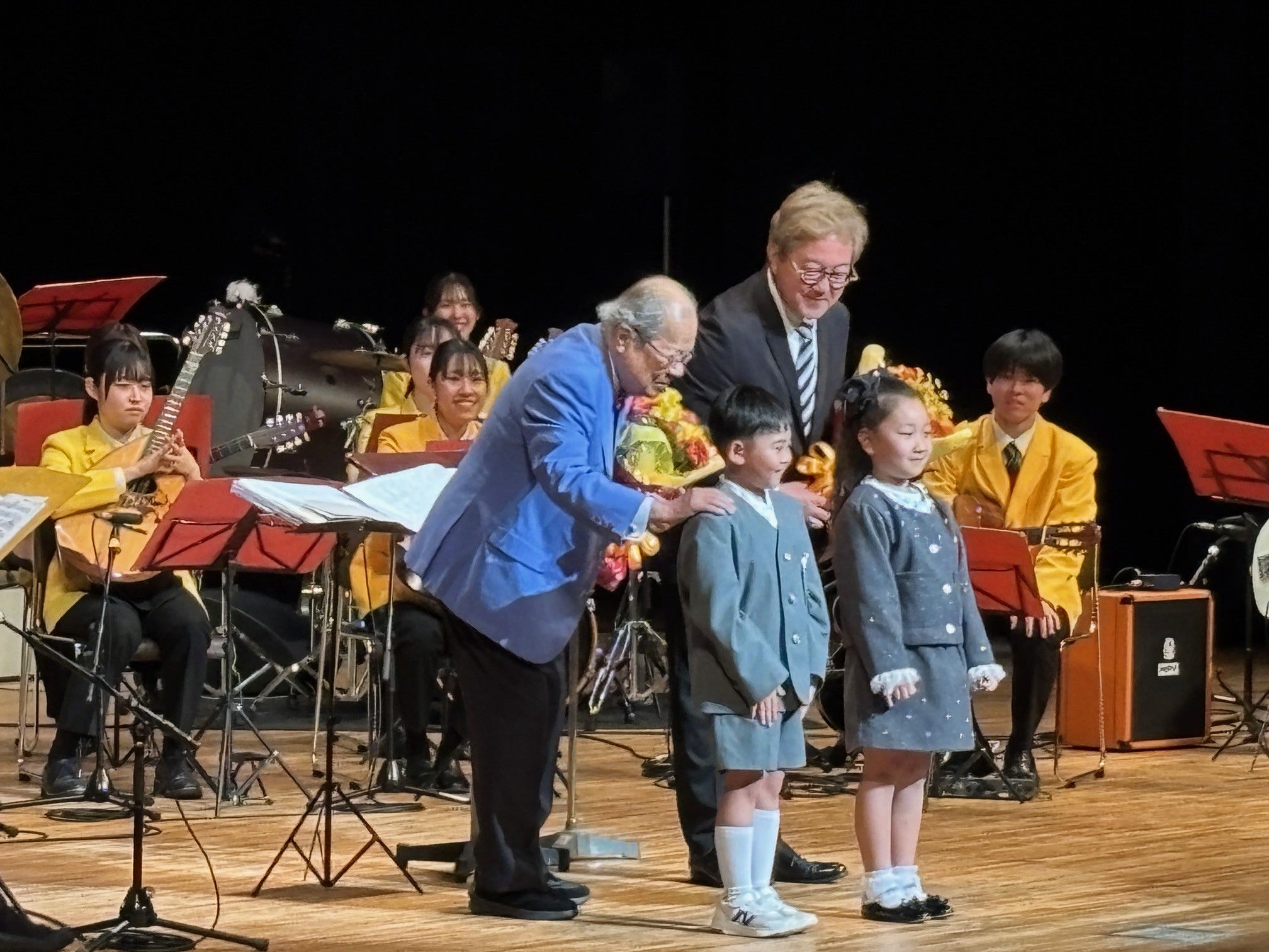 可愛い花束のプレゼンターお二人は沼津地域支部 久保田支部長のお孫さん。照れながらも花束を渡す愛らしい仕草に会場は拍手と笑顔で包まれました。花束を受け取った甲斐先生とグリークラブ紫紺会の渡辺会長も目を細めずにいられない一幕も!ありがとうございました!