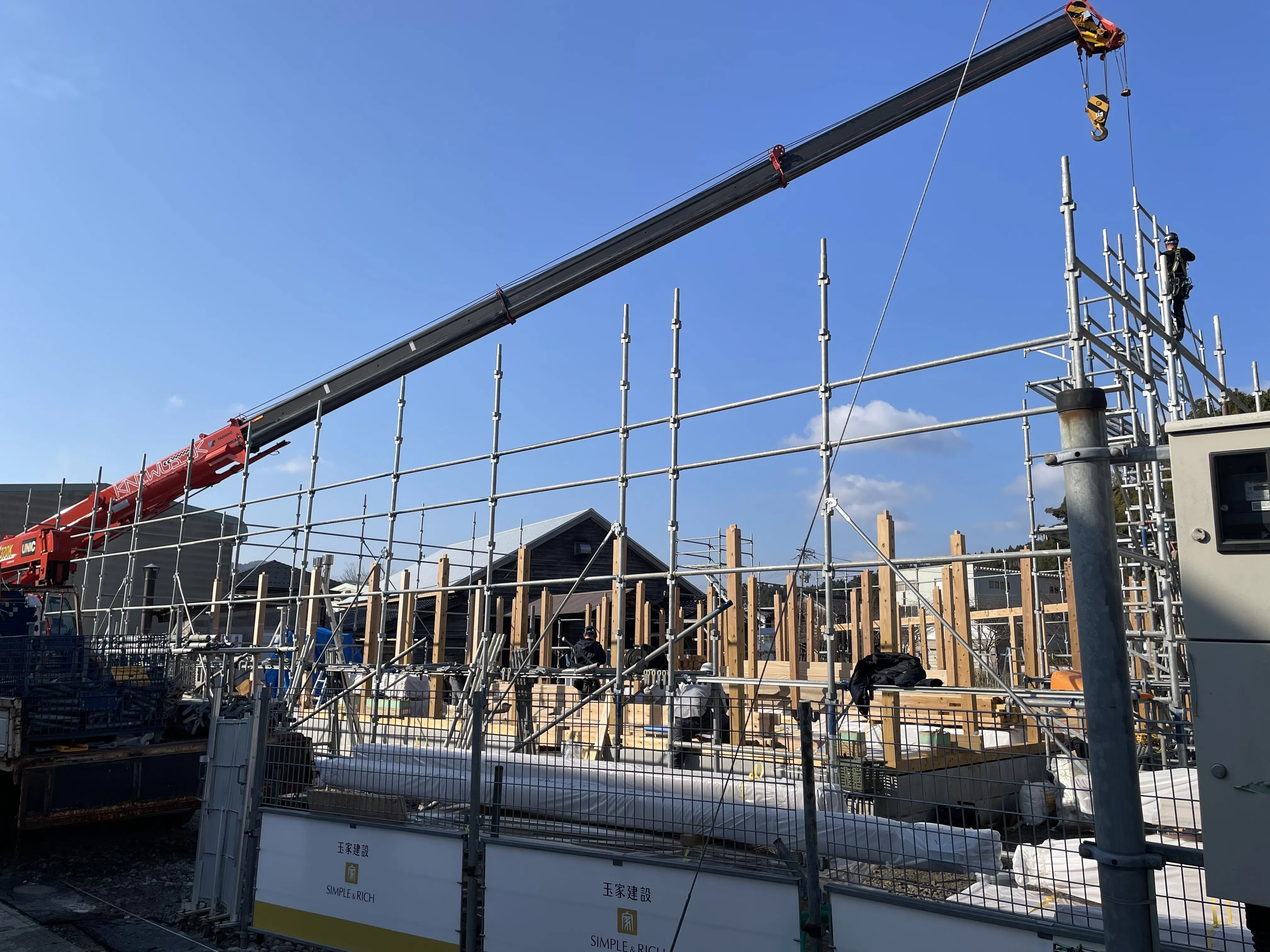 こんにちは。谷川醸造・谷川千穂です。長い基礎工事も終わり、今日から建て方工事が始まりました。朝からクレーン車と大勢の大工さん(総勢15名!)が来て、午前中は1階部分、午後からは2階部分の柱を建てていき、あっという間に建物の大枠が見えてきました。すごいスピードでビックリします。柱が建つと急に建物...