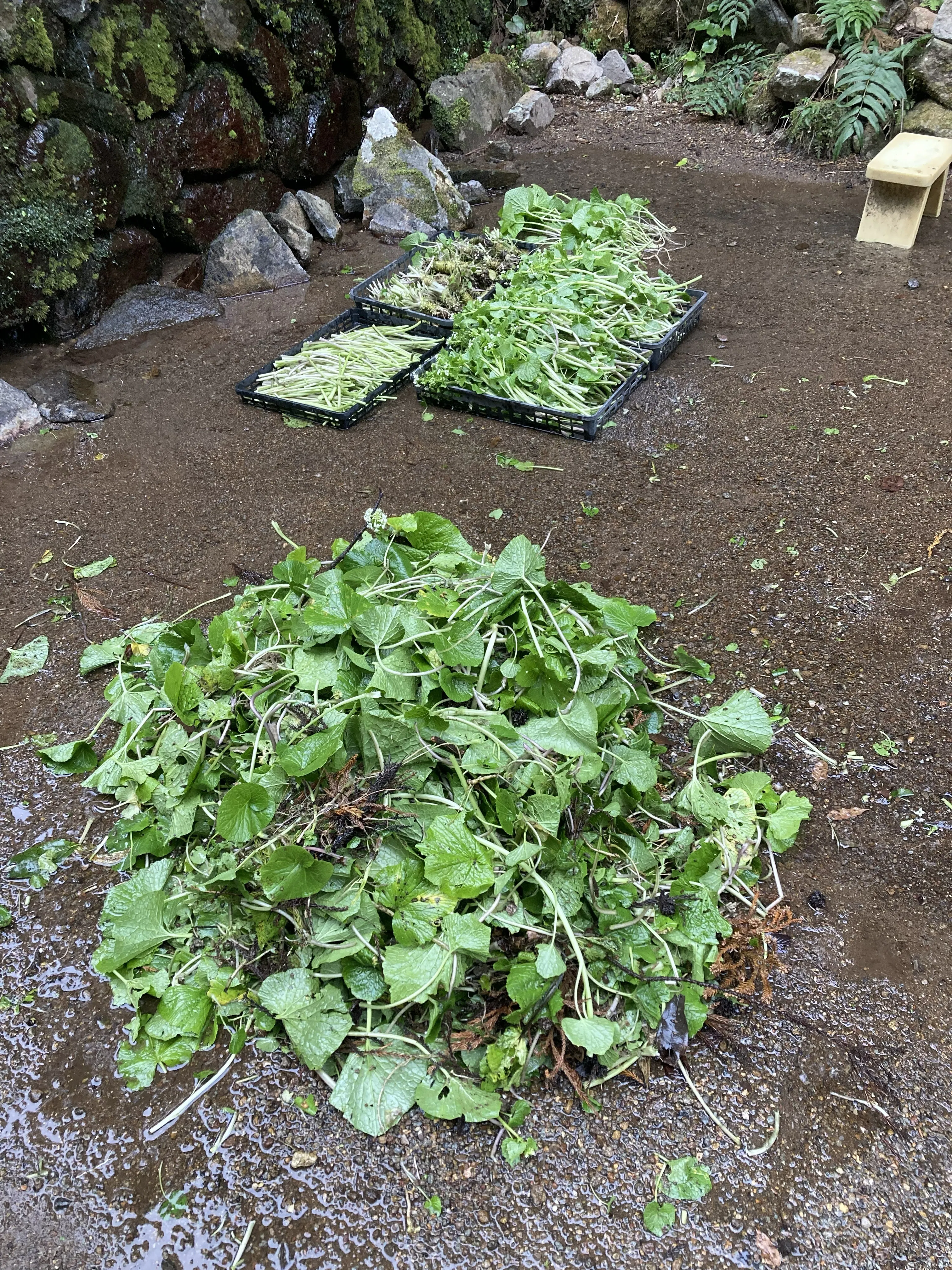 今回は強力なポンプを使い田を耕してきました。苗はまだ未入荷ですが、これで田植えの準備完了です。写真は収穫し、簡易的に下処理をした様子です。花わさびは今が最盛期!夜は楽しみな焚火直火はなにを焼いても美味しい!