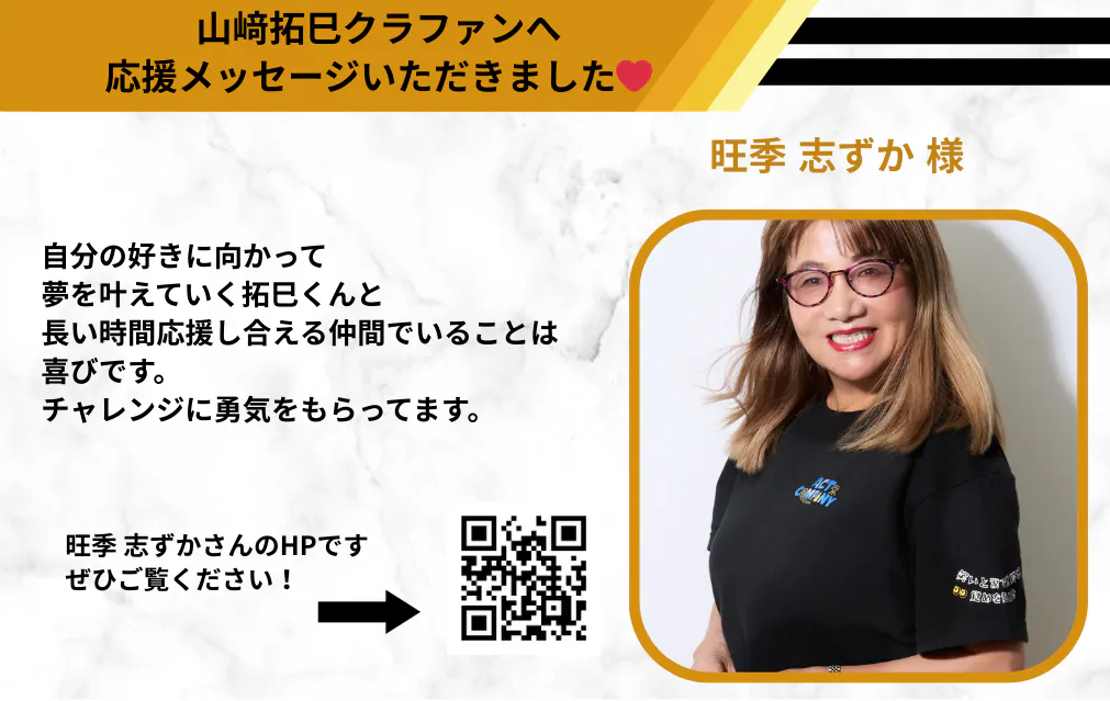 こんにちは!【旺季 志ずか】様、【JOY RICA】様、【波動専門家 Tamy】様から、山﨑拓巳のクラウドファンディングへ応援メッセージをいただきました!本当にありがとうございますm(_ _)m【旺季 志ずかさん】旺季 志ずかさんのHPですぜひご覧ください!https://www.ouki-s...
