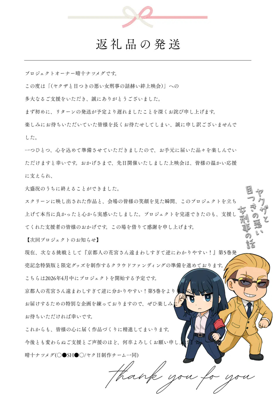 この度は当プロジェクトへご賛同誠に有難うございます。また小児がん支援啓発にご理解ご協力ありがとうございます。タイトルについてのご報告になります。お届け予定の『瑠璃の益子焼』製作者のご家庭にこの度ご不幸がありお葬儀の関係で予定してました納期に間に合わないとのご連絡がありました。私としましても故人...