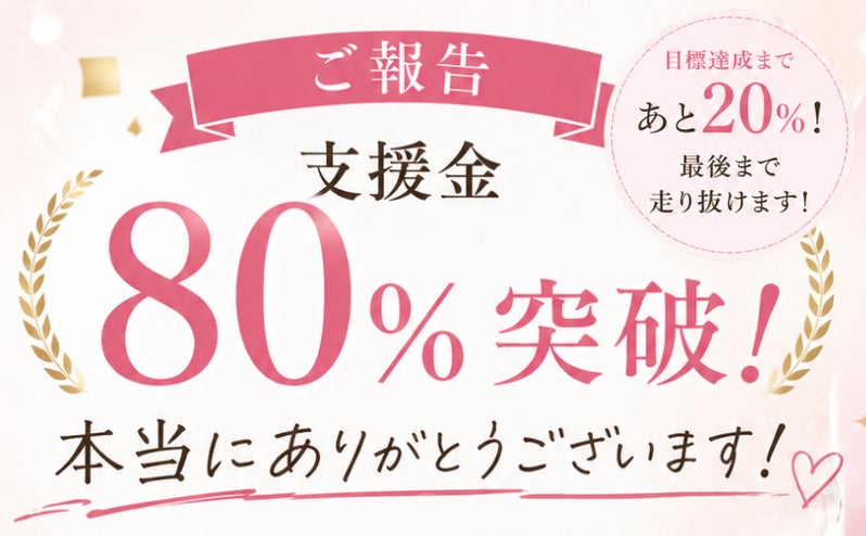 いつも応援していただき、本当にありがとうございます。この度、CAREMEプロジェクトの支援金が80%を突破しました。ここまで来られたのは、間違いなく、支援してくださった皆さまのおかげです。本当にありがとうございます。正直に言うと、スタート当初はここまで来られるか不安もありました。それでも、「共...