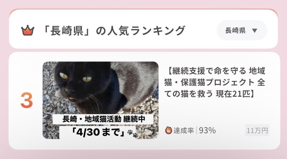 長崎県 人気ランキングにて3位になることができました。たくさんのご支援・応援、本当にありがとうございます。皆さまのお力で、ここまで来ることができました。現在、地域猫・保護猫は21匹。日々のご飯、医療、去勢・避妊手術など命を守るための活動を続けています。達成率は【93%】いよいよゴールが見えてき...