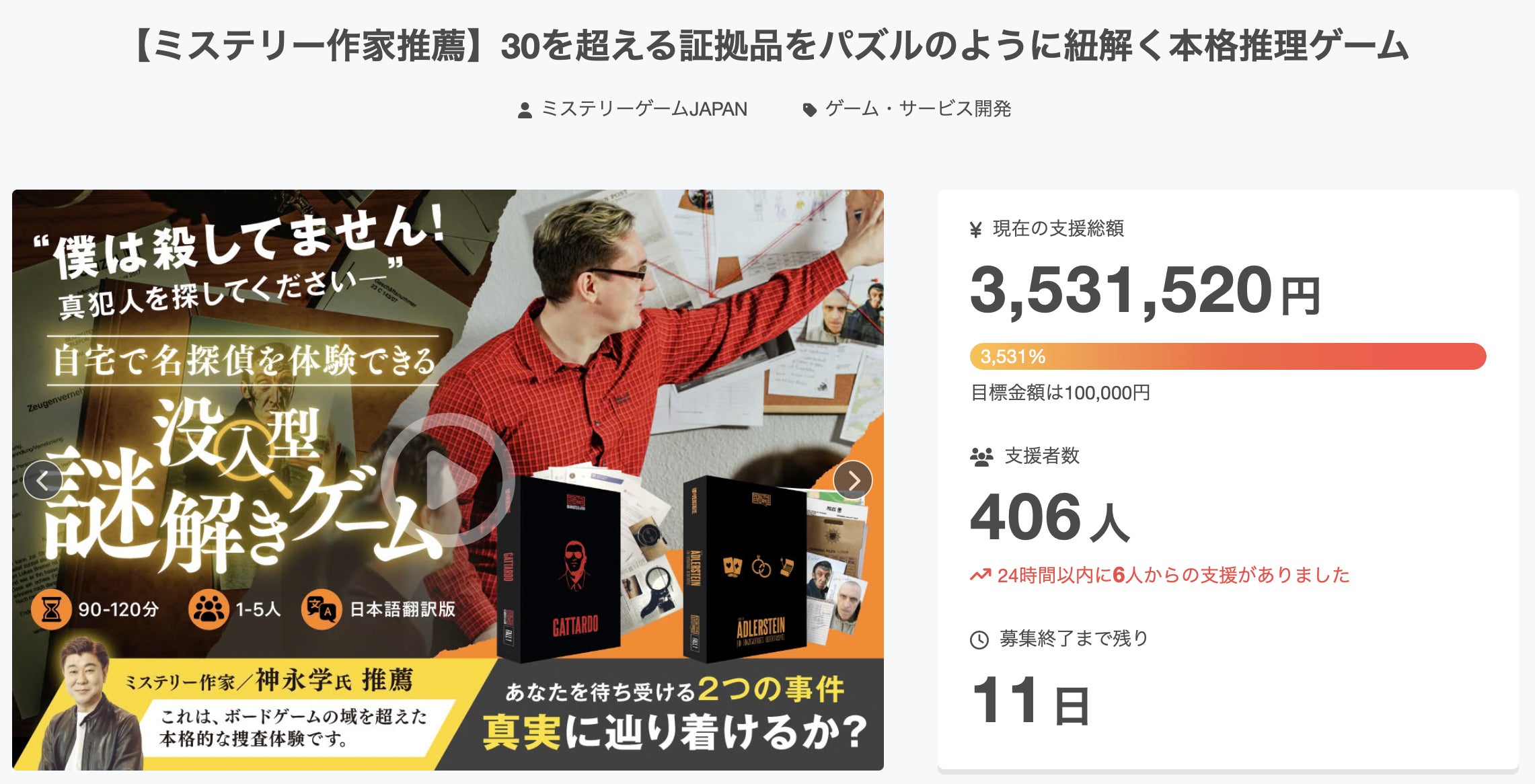 ミステリーゲームJAPANです。お読みくださりありがとうございます!ドイツ発“30を超える証拠品から犯人を探す”という日本にはまだあまりない「本格推理ゲーム」を完全日本語化して初回する本プロジェクト。CAMPFIRE公開1ヶ月で、400名様にご支援いただき支援金額は350万円を超えました。応援...