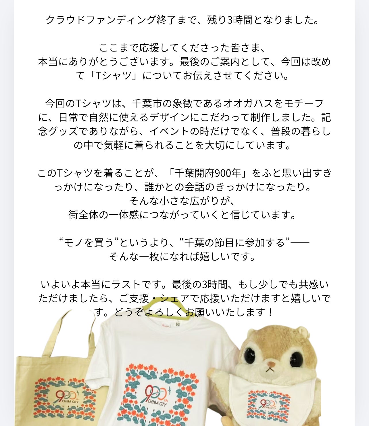 クラウドファンディング終了まで、残り3時間となりました。ここまで応援してくださった皆さま、本当にありがとうございます。最後のご案内として、今回は改めて「Tシャツ」についてお伝えさせてください。今回のTシャツは、千葉市の象徴であるオオガハスをモチーフに、日常で自然に使えるデザインにこだわって制作...