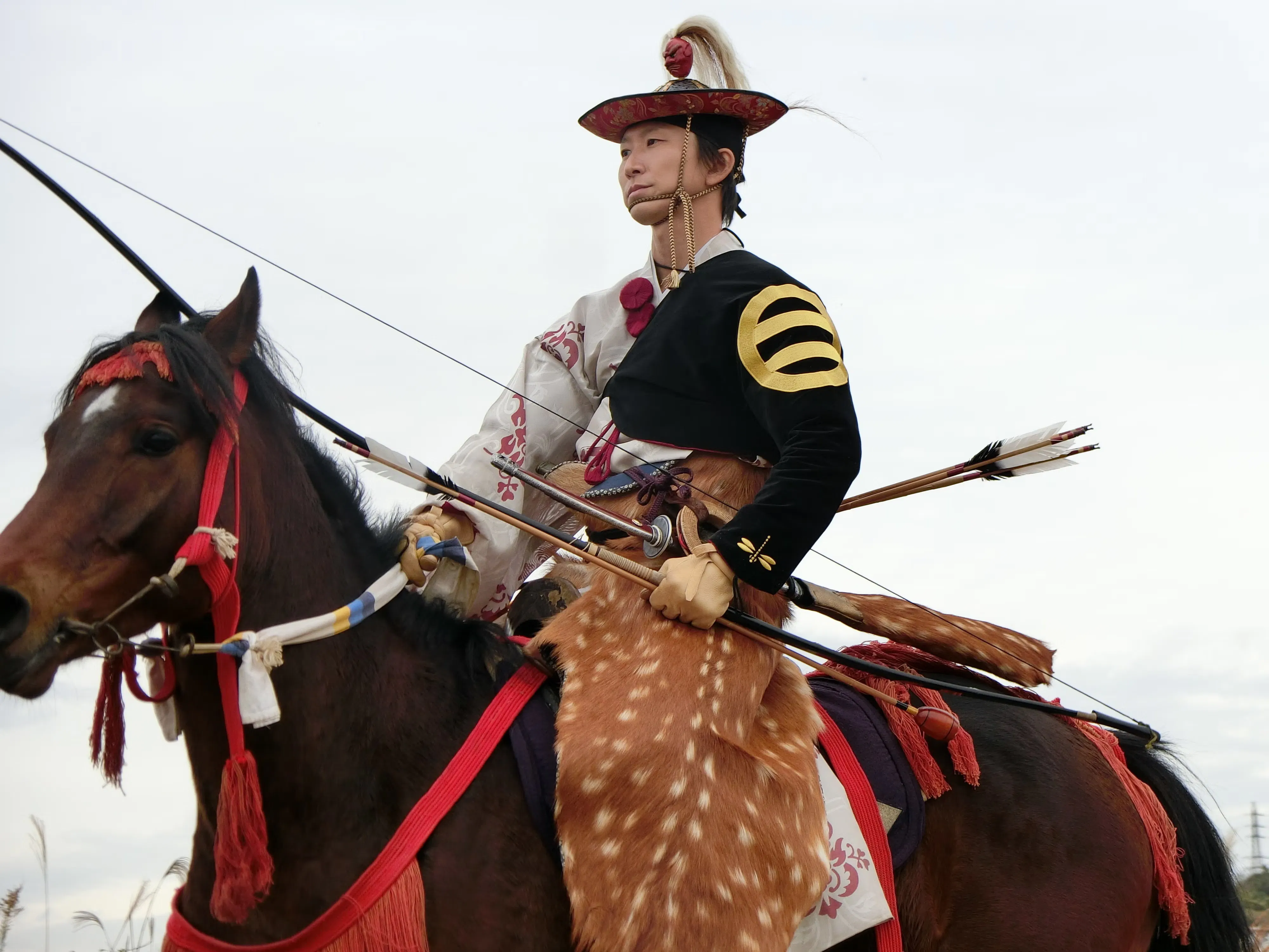 流鏑馬の射手装束や馬具は、とても特徴的なものとなっております。ぜひ説明をさせてください。流鏑馬神事に出場する射手は、鬼面綾檜笠(きめんあやひがさ)をかぶり、直垂(ひたたれ)または素襖(すおう)を身につけます。左腕には各射手の家紋が金糸で縫い取られた射籠手(いごて)をつけ、腰には鹿の夏毛で作られ...