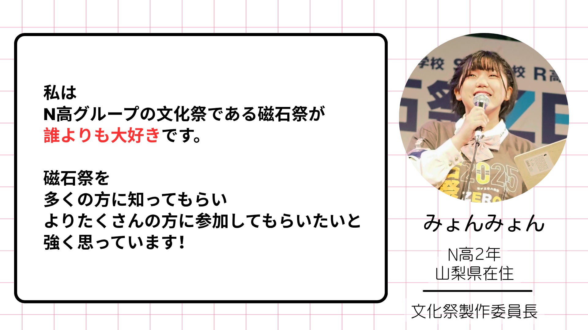 みなさんこんにちは。文化祭製作委員長のみょんみょんです!私は、N高グループの文化祭である磁石祭が誰よりも大好きで、磁石祭を、生徒一人ひとりに知ってもらい、よりたくさんの生徒に参加してもらいたいと思っています。一方で、文化祭自体の存在を知らない生徒や、距離などのハードルの問題で参加を諦めている生...
