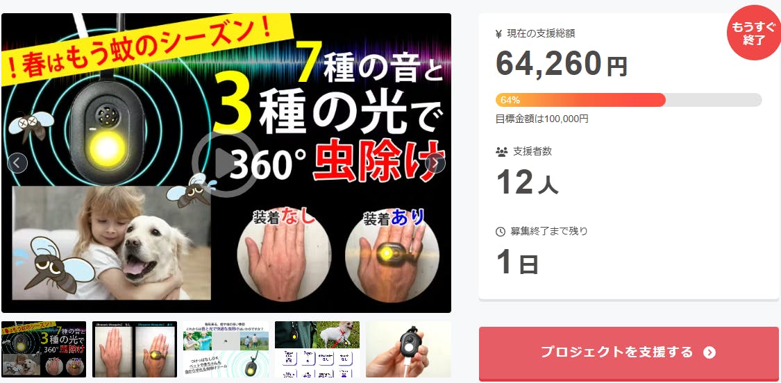 ご支援者様、蚊よけバンドが《音+光》でさらに進化!赤ちゃん・ペットにも使える全方位虫よけタグにご興味をお持ちいただきありがとうございます。お陰様で、開始から支援総額6万円達成することができました!終了までわずか 1 日となります。① 薬剤不使用 ② 臭いなし ③ 環境に優しい ④ 高齢者や子供...