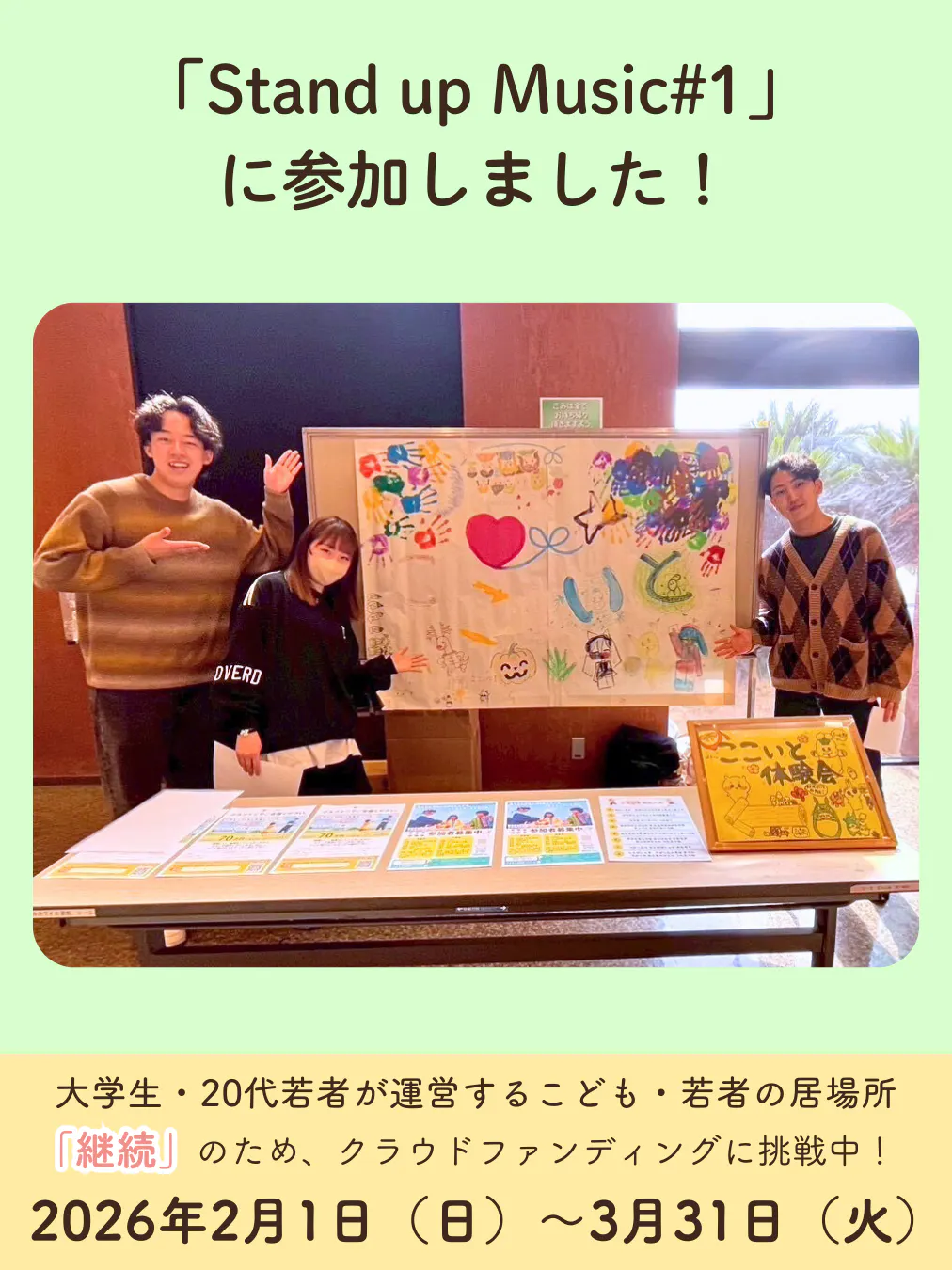 2月22日(日)に「Stand up Music #1」というイベントに参加してきました!(「NPO法人キャリアサポートセンター奈良」主催・「こども支援団体ここいと」共催)会場には、体験会でこどもたちと一緒に模造紙いっぱいに絵を描いた“ここいと旗”を展示しました!みんなで思いを込めて作った作品...