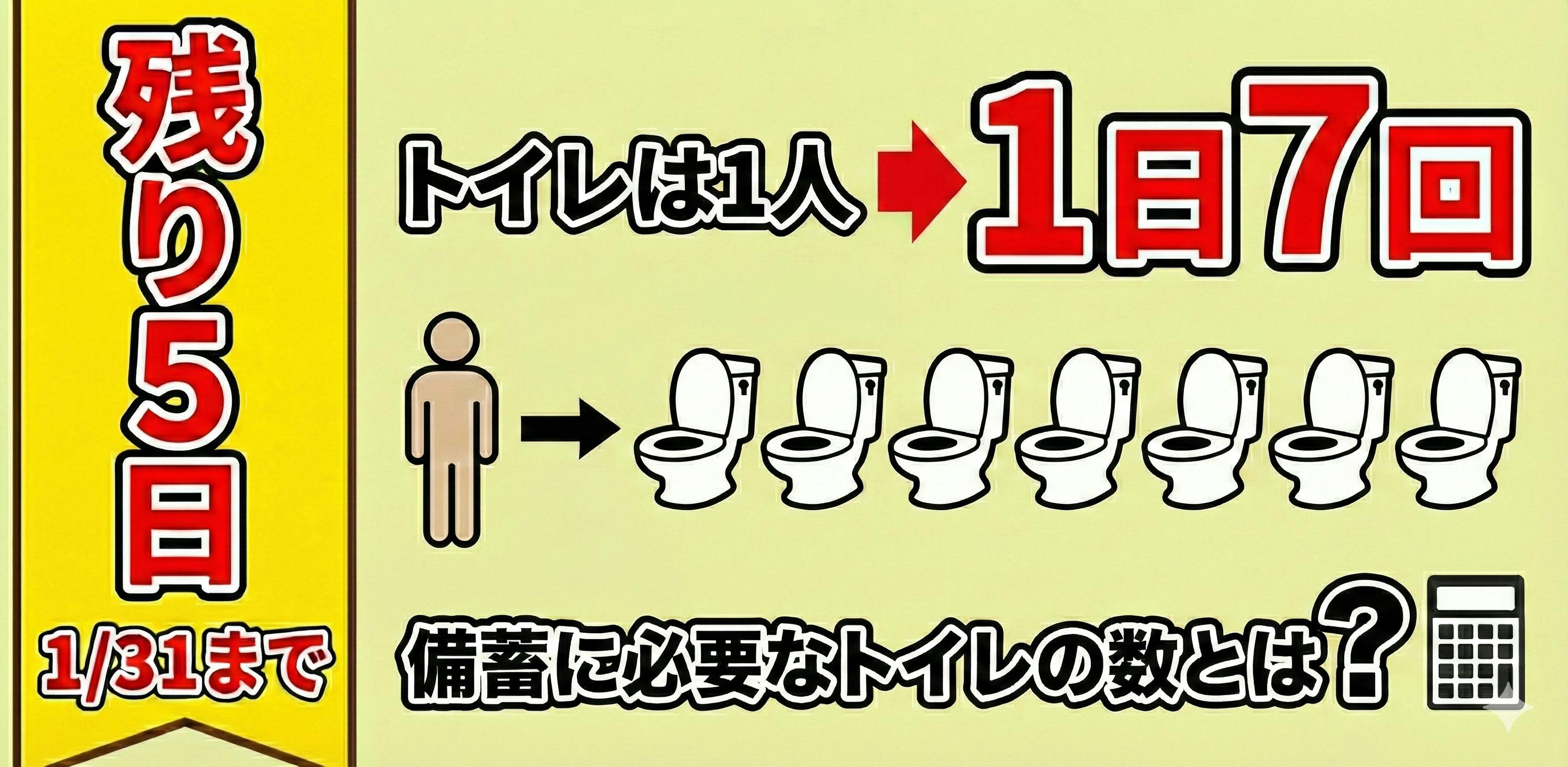 ダンボールトイレ「チョイレ」のクラウドファンディング、いよいよ募集終了まで残り5日となりました。本日は、支援者の方からも多くご質問をいただいている「実際、どれくらいのトイレを備えればいいのか?」というテーマについてお伝えします。■災害時、トイレは何回必要になるのか防災について考えるとき、「何日...