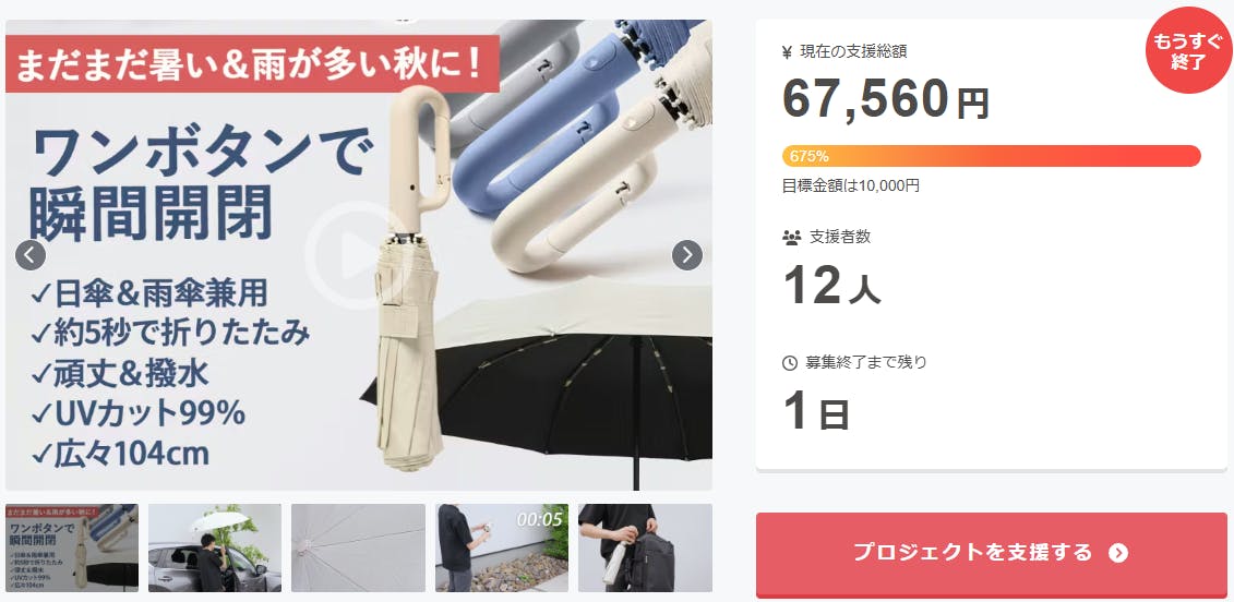 ご支援者様、【99%遮光!超撥水!折り畳み約5秒!】ワンタッチ楽々開閉の晴雨兼用折りたたみ傘にご興味をお持ちいただきありがとうございます。お陰様で、開始から支援総額6万円達成することができました!終了までわずか 1 日となります。<ボタンひとつでサッと開閉、収納もわずか数秒。高密度の防水...