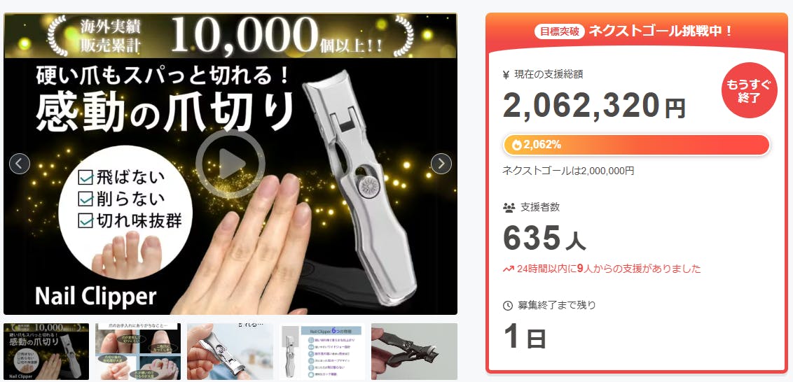 ご支援者様、硬い爪もスパッと切れる!爪が飛び散らない・やすり掛けもいらない快適な究極の爪切りにご興味をお持ちいただきありがとうございます。お陰様で、開始から支援総額200万円達成することができました!終了までわずか 1 日となります。<硬くなってしまった爪もさくっと切れて美しい仕上がりに...