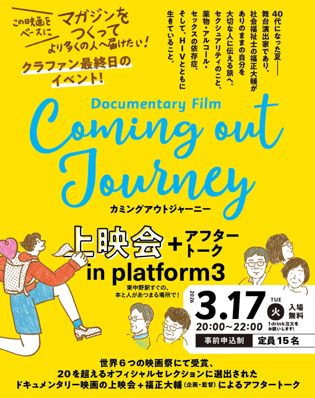 「カミングアウトジャーニーマガジン」プロジェクトのスタッフのコケ丸です。突然ですが、このクラファンの最終日でもある3月17日(火)20:00から22:00まで、東京・東中野にあるplatform3という本屋さんで、「カミングアウトジャーニー」の上映会(①のみ)と福正大輔によるアフタートークを開...