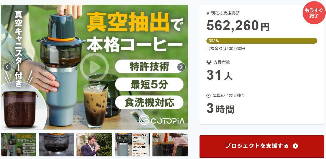 ご支援者 様、特許技術で深い味わいを最短5分で実現。真空抽出コーヒーメーカー+密封キャニスターにご興味をお持ちいただきありがとうございます。お陰様で、開始から支援総額56万円達成することができました!終了までわずか 3 時間となります。時間を計ってみるとちょうど5分で下に押し出されていきました...
