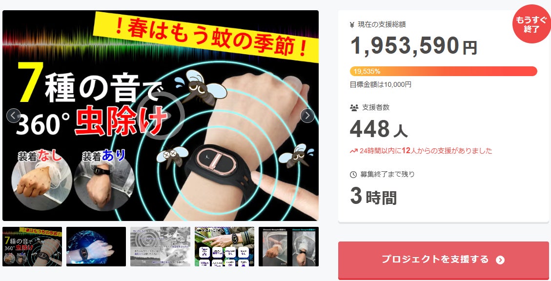 ご支援者 様、春はもう蚊の季節!赤ちゃんやペットにも使える、7種の音波で全方位虫よけバンドにご興味をお持ちいただきありがとうございます。お陰様で、開始から支援総額190万円達成することができました!終了までわずか 3 時間となります。お子様や高齢者のいる家庭でも、Ultrasonic Mosq...
