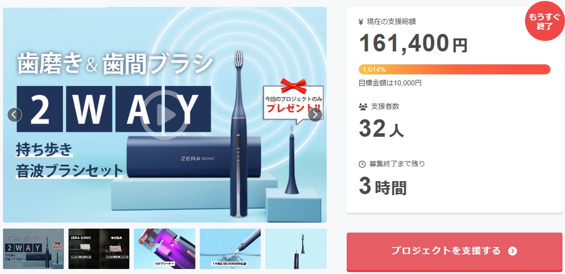 ご支援者 様、UVクリーナーとマイクロファンでいつでも新品同様衛生的!2Way音波ブラシセットにご興味をお持ちいただきありがとうございます。お陰様で、開始から支援総額16万円達成することができました!終了までわずか 3 時間となります。ZERA SONIC歯ブラシは、歯ブラシと歯間ブラシを一体...