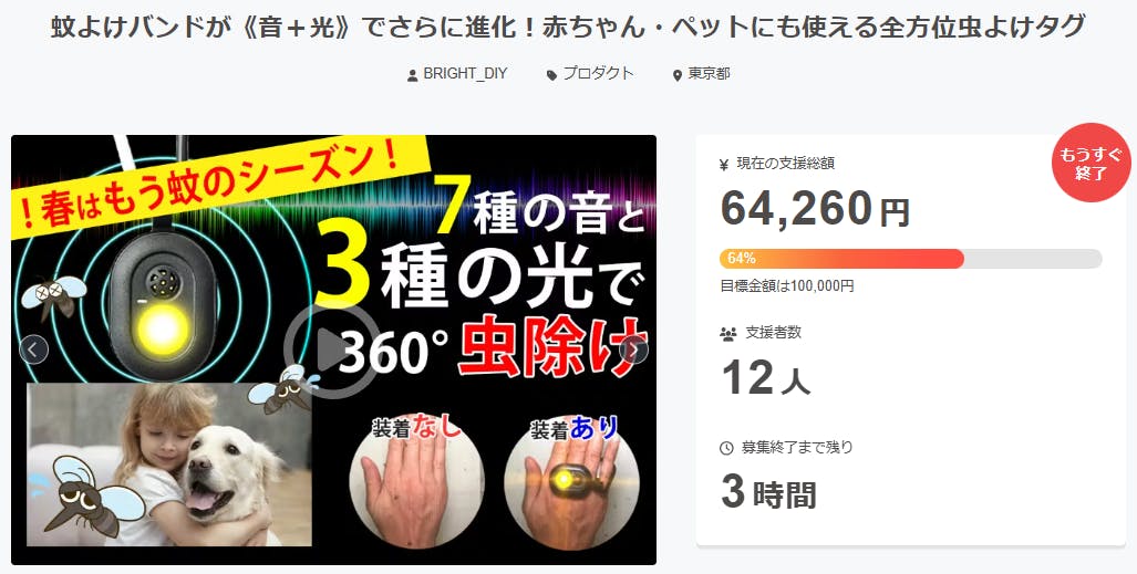 ご支援者様、蚊よけバンドが《音+光》でさらに進化!赤ちゃん・ペットにも使える全方位虫よけタグにご興味をお持ちいただきありがとうございます。お陰様で、開始から支援総額6万円達成することができました!終了までわずか3時間となります。① 薬剤不使用 ② 臭いなし ③ 環境に優しい ④ 高齢者や子供、...