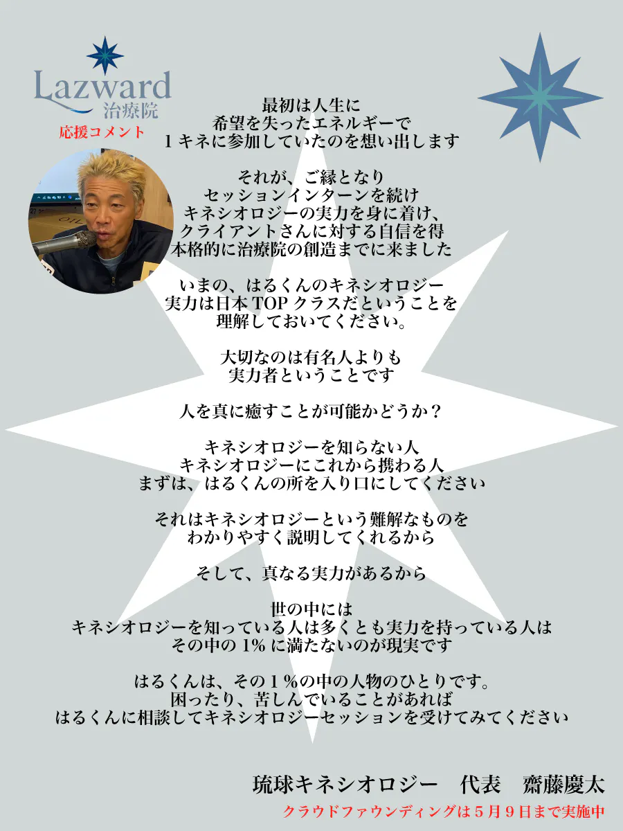 \応援コメント頂きました!/齋藤慶太(琉球キネシオロジー代表)から応援コメント頂きました!ありがとうございます。齋藤慶太のキネシオロジーのおかげで今があります。クラウドファンディングは残り36日、引き続き応援よろしくお願いいたします!