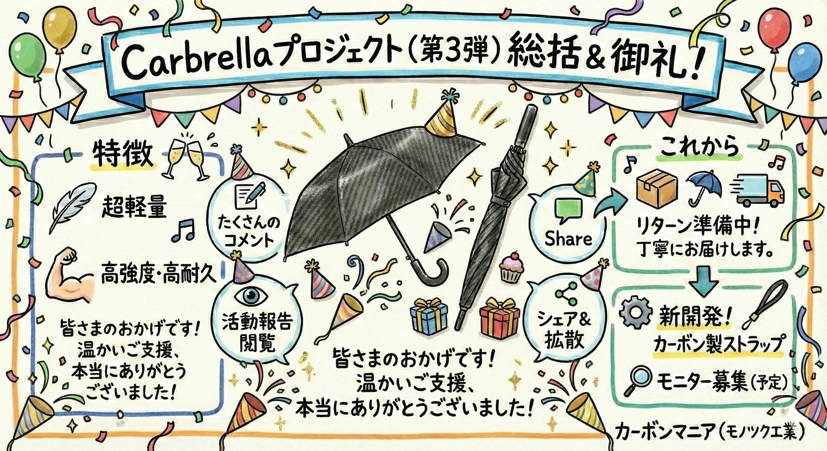 こんばんは、カーボンマニア(モノツク工業)です。本日23:59をもちまして、Carbrella(第3弾)プロジェクトが終了しました。11月末のスタートから約2ヶ月間、活動報告を読んでくださった方、コメントをくださった方、お気に入り登録してくださった方、そしてご支援いただいた方。皆さまのおかげで...