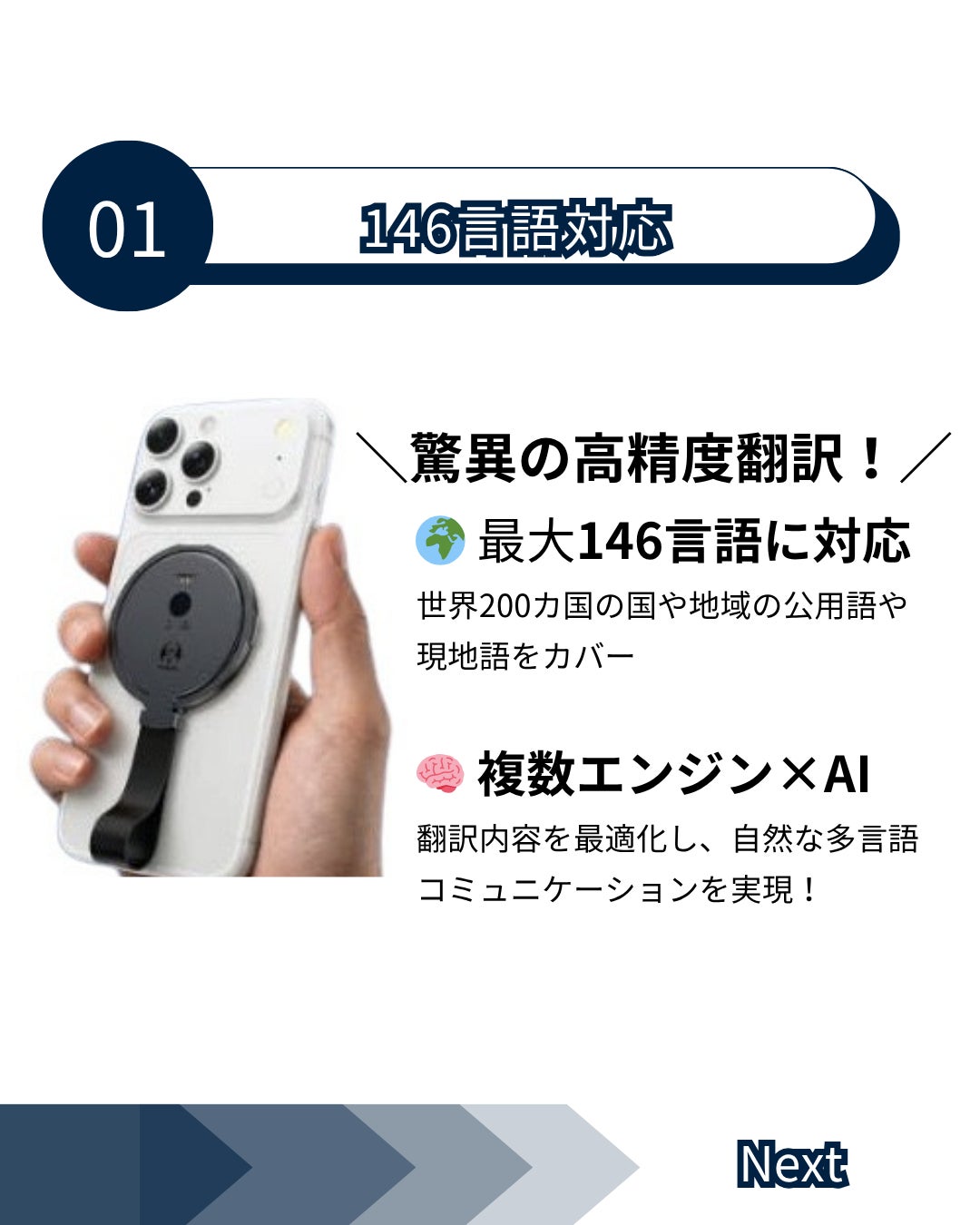 スマホに装着するだけで多言語コミュニケーションが叶う、スマホリング型AI翻訳機が新しくなって登場! 2026年4月28日午前7時より、限定販売を開始いたします!販売日に向けて、X9の魅力を順番にご紹介していきます。まずは基本の翻訳性能から▼✔ 最大146言語に対応 世界200カ国以上の公用語...