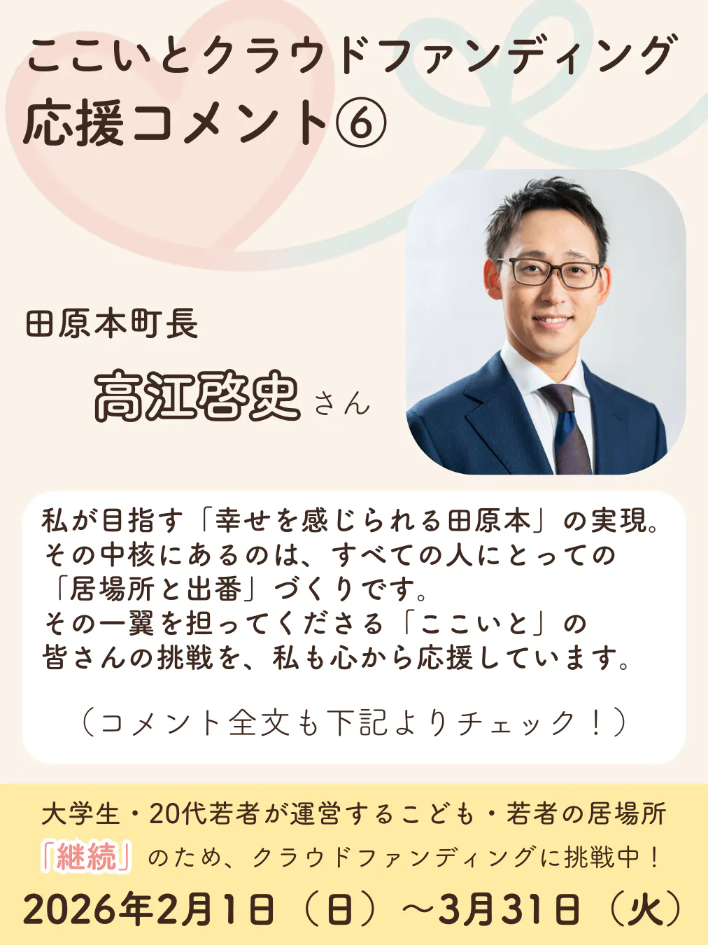 「ここいと」の活動への応援コメントをご紹介します。ーーー以下、応援コメント全文ーーー昨年12月25日、地元企業の一室を訪問すると、そこには、そこにいるすべての人にとって「居場所と出番」のある空間が広がっていました。その場にいる誰もが、「今あるありのままの自分でいいんだ」と感じられる、そんな優し...