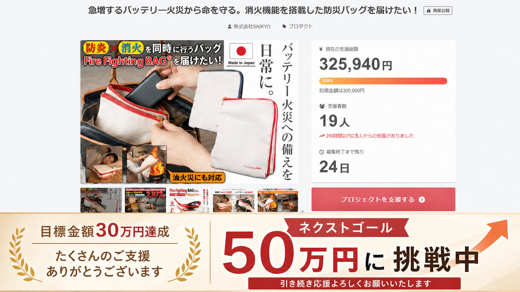 バッグの量産化に向けた第一歩として、まずは30万円を目標金額と設定いたしました!現在、更なる目標に向かって、ネクストゴール50万円を目指して挑戦を続けています。皆さまからいただいたご支援を力に、より多くの方へこのバッグを届けられるよう、量産化に向けた準備をさらに前へ進めてまいります。また、防災...