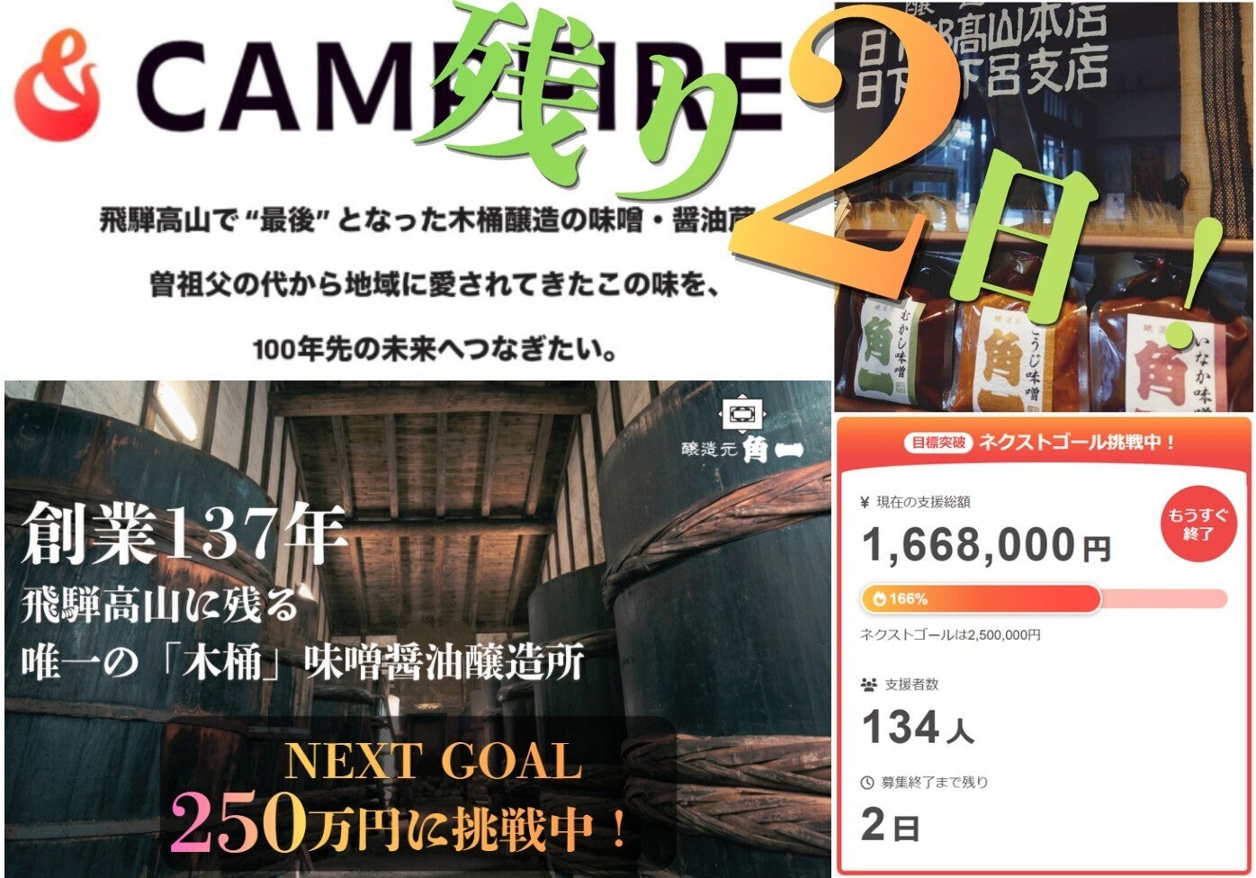 いつも温かいご支援・応援をいただき、誠にありがとうございます。クラウドファンディング終了まで、いよいよ【残り2日】となりました。ここまで支えてくださった皆さまに、心より感謝申し上げます。今日は蔵からすぐ近く、高山の中心地の「古い町並み」で応援依頼のお声がけをしていきます!さて、クラウドファンデ...