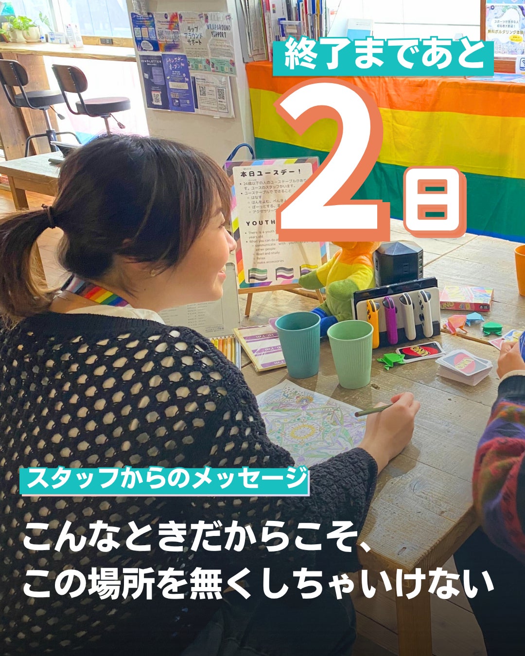 クラウドファンディング【LGBTQ+の子どもたちに 「ひとりじゃない」を届けつづけたい!】の終了まであと2日となりました!現在80%…今日、目標の85%以上を達成したいです…!ユーススタッフのりんさんからのメッセージですーーーーーーーーーー約4年間、ここでユースの居場所づくりに関わってきました...