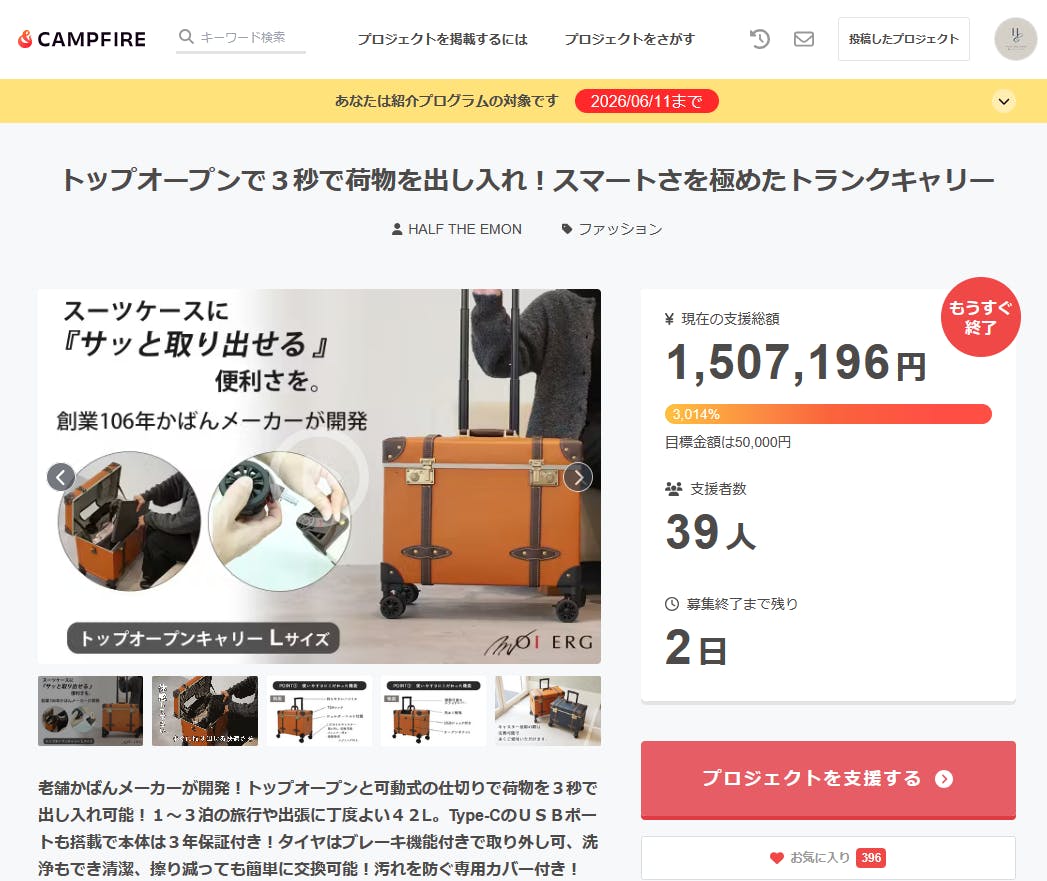 『探していた条件(上開き、キャスターストッパー、内寸)に一致するキャリーケースでした。とても楽しみにしています!』『使用している方が絶賛してました。楽しみにしています。応援しています!頑張ってください!』と支援者の方々から続々とコメントを頂いております。。。とにかく、残り2日間です。。。世の中...