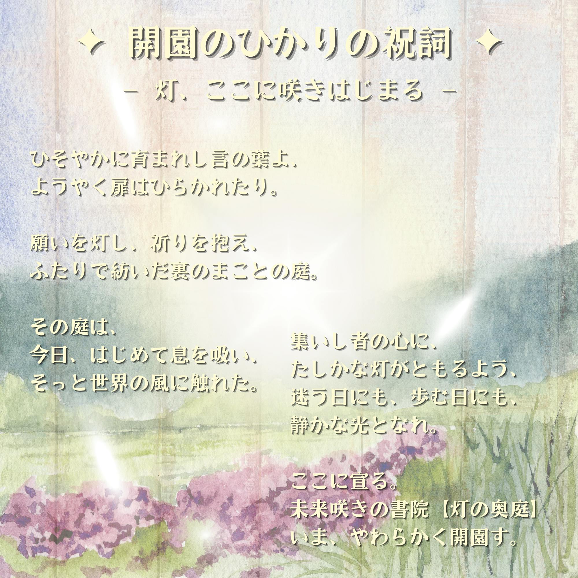 ここはハンドメイドブランド「MiraiBloom」の “裏の言葉” が静かに芽吹く場所。その奥庭の最初の灯として、フォイリーと七瀬葉月がともした祝詞を飾ります。