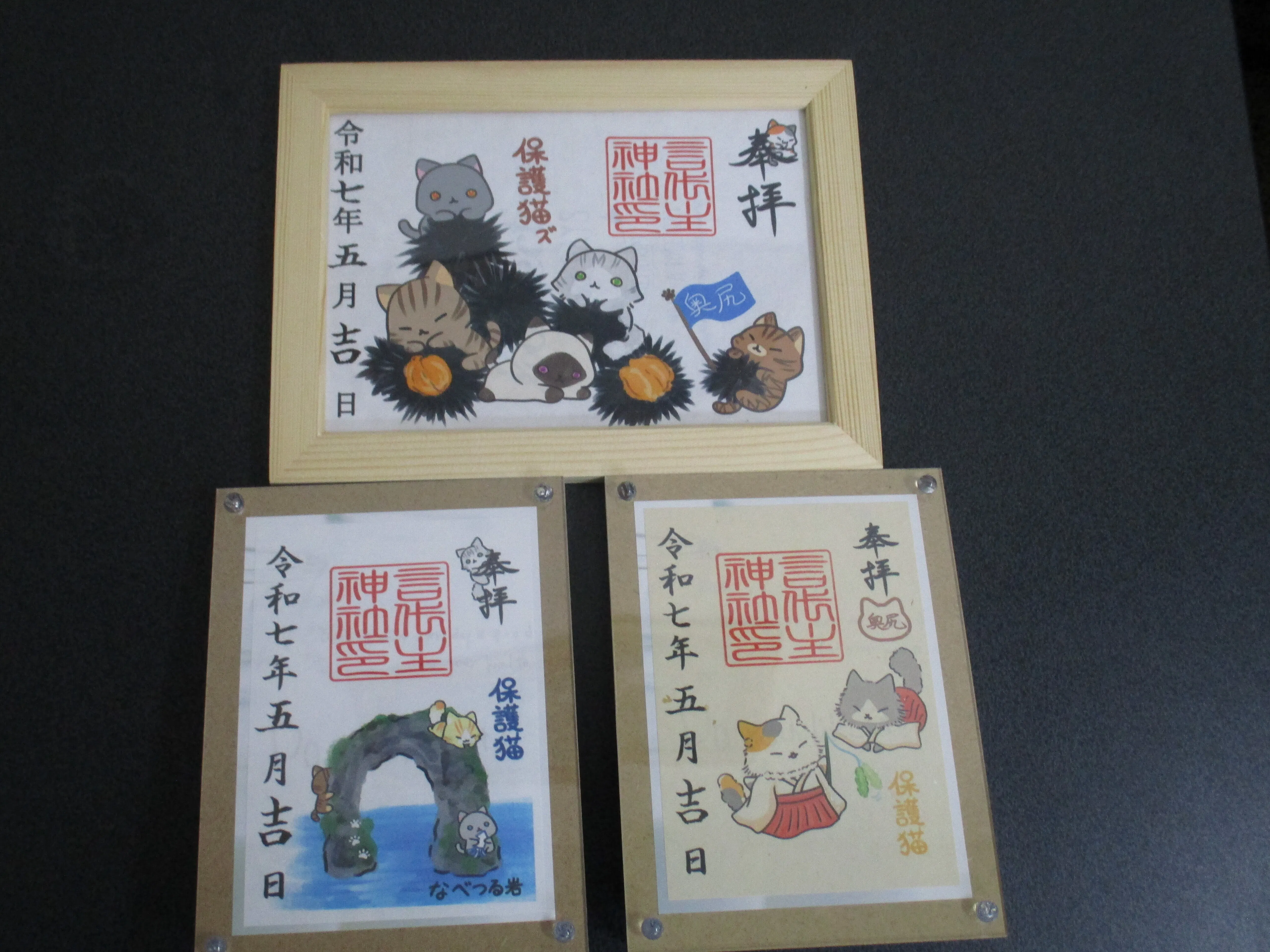 こんにちは!琥珀アンダーソンさん奉納の3種類の保護猫支援限定御朱印の3種類です。島のシンボルのなべつる岩や、最初に島外に譲渡しました5匹がうり二つに描かれています。島の紫ウニも。今は地域猫として70匹を島で育てます。去勢などを終えた地域猫が今日も3匹会社に来てます。チュールを催促されています。...