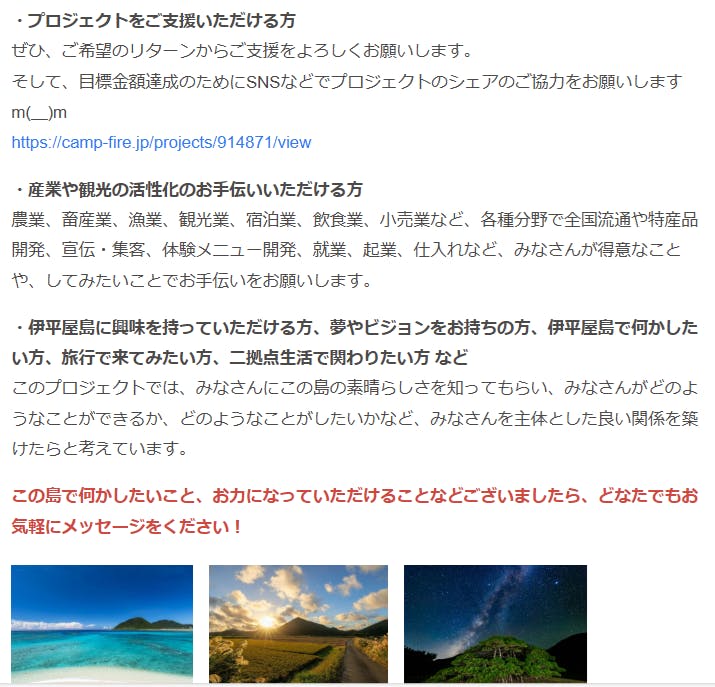 このプロジェクトは伊平屋島全体の活性化を目的にしたため、このプロジェクトが何をしたいのか、皆様がどのように関われるのかが分かりにくかったため、プロジェクト記載を修正しましたのでご覧ください支援金額はなかなか増えませんが、毎日、みなさんからクライドファンディングサイトやInstagramからメッ...