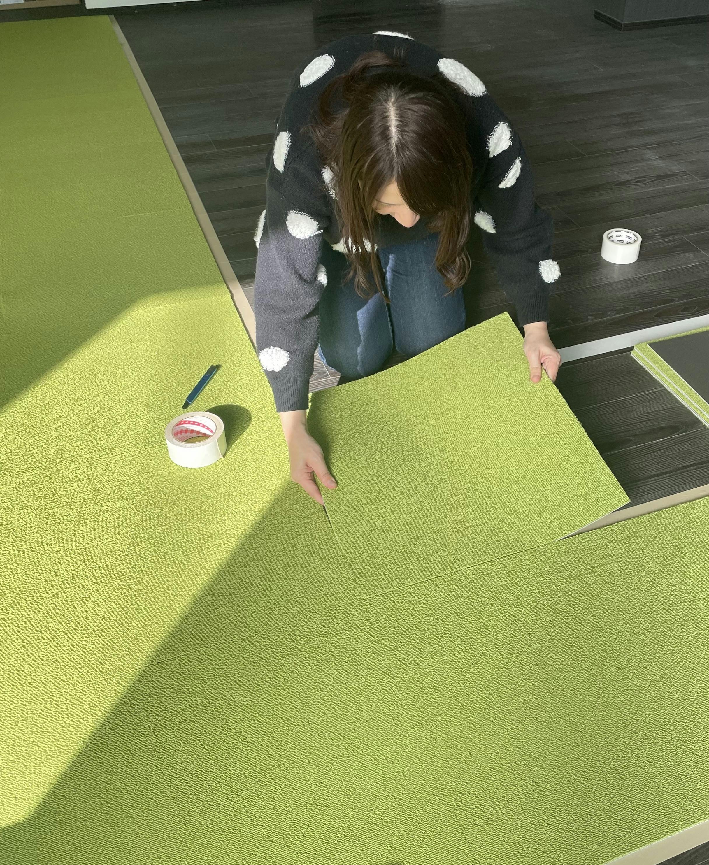 本日より、リフォームを開始しました。リフォーム代節約のため、私もタイルカーペット貼りに参加しました。養生テープを貼り、カーペット用両面テープを貼り、タイルカーペットを敷き詰めました。端っこはカットが必要なので、職人さんにお願いしました。明日もニス塗りなど、できる範囲で参加します。皆様からいただ...
