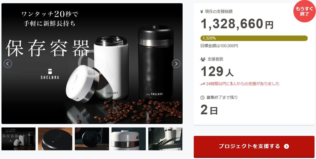 ご支援者様、耐久性抜群のステンレス真空キャニスターで珈琲豆の鮮度を守り長期間保存可能!にご興味をお持ちいただきありがとうございます。お陰様で、開始から支援総額132万円達成することができました!終了までわずか 2 日となります。<ワンタッチでわずか20秒、誰でも簡単に真空保存ができる新し...