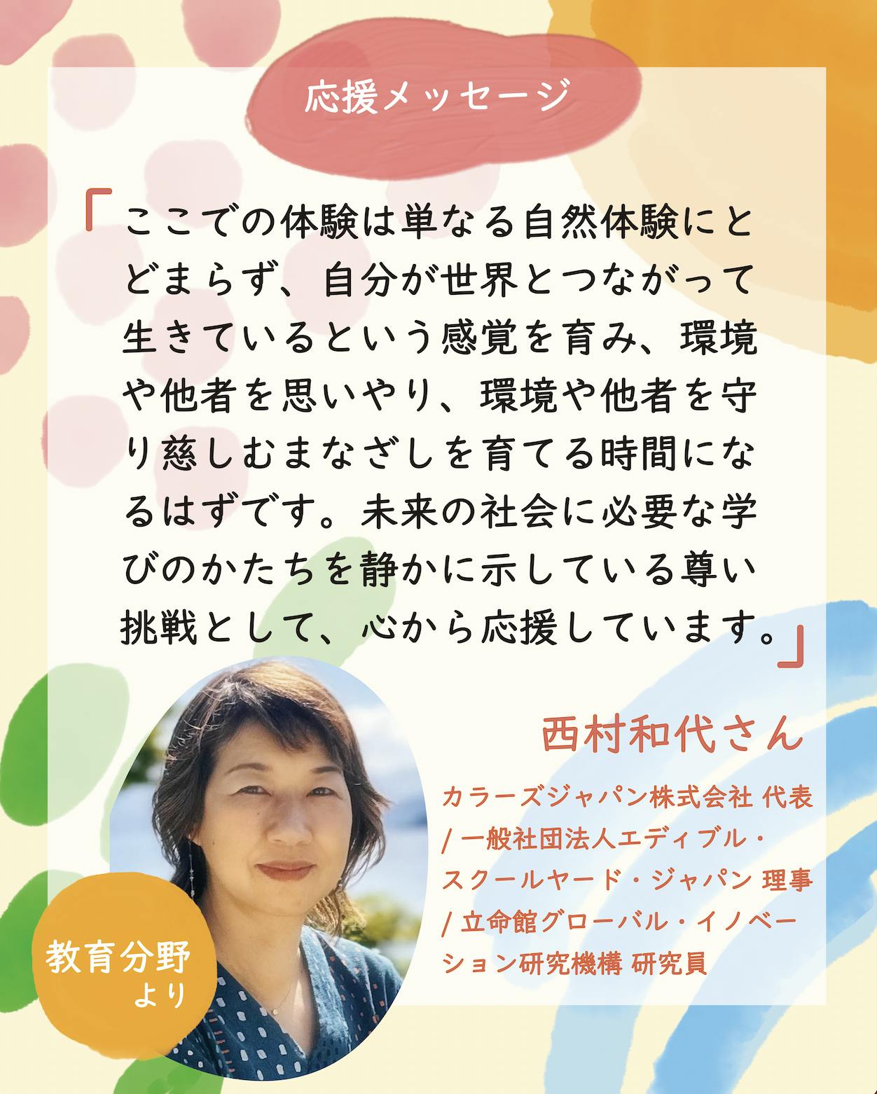 応援メッセージエディブル・スクールヤード・ジャパンの活動を共にしている西村和代(にしむら かずよ)さんから応援メッセージをいただきました!環境教育の分野で活躍される和代さんは、事業や活動だけではなく、身の上話も含めて大切なことを相談させていただく私たちの母親的存在です。和代さんとつくるエディブ...