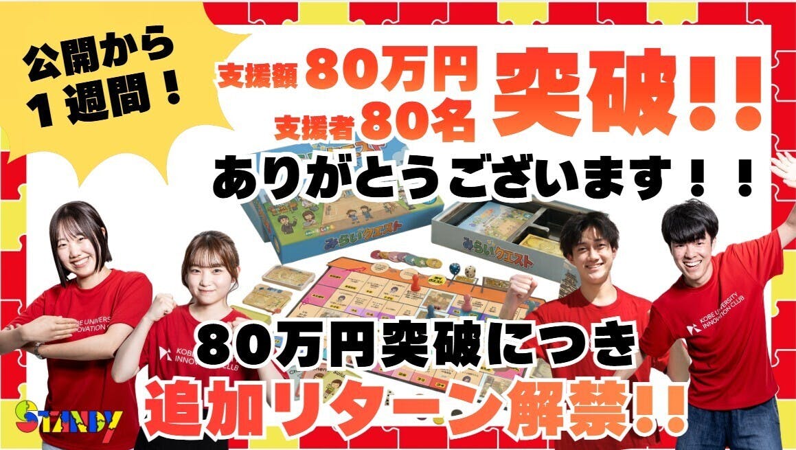 プロジェクト公開から約10日、なんと支援額80万円・支援者様80名を突破いたしました!僕たち自身、こんなに速くここまで来られたことに、驚きと感謝の気持ちでいっぱいです、、!!皆様の温かいご支援とご声援を最大のエネルギーにして、最終日まで全力で駆け抜けていきます!そして本日は、さらなる躍進で皆様...