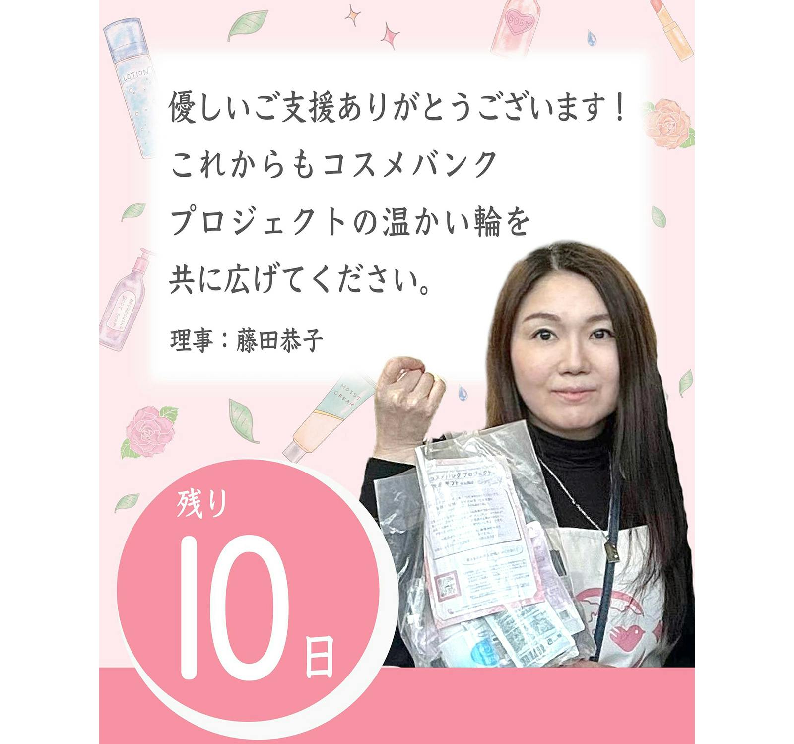 2月の第一目標達成から数週間。現在までに110万円のご支援が集まっています。コスメバンクプロジェクトの輪が着実に広がっていることを実感しており、皆様の温かい応援に心より感謝申し上げます。日々の生活に追われ、自分のことを後回しにしてしまいがちな女性たちにとって、届いたコスメは単なる「物」ではあり...