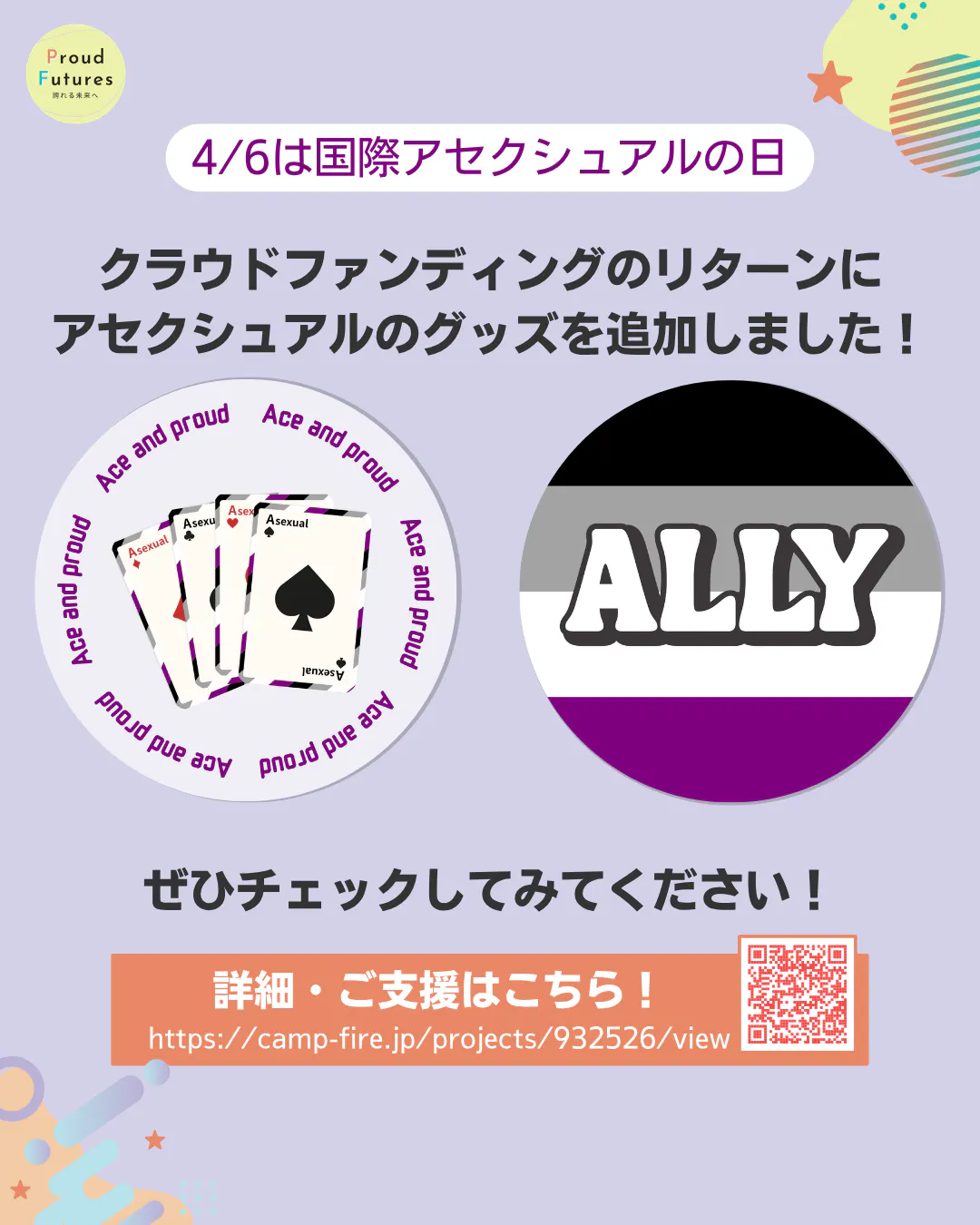 4月6日は国際アセクシュアルの日です。アセクシュアル・フラッグのグッズを身につけることは、アセクシュアルについて周りの人に知ってもらったり、アセクシュアルのアライであることを示すことに繋がります。そこで、わたしたちのクラウドファンディングのリターンにアセクシュアルに関するグッズを新しく追加しま...
