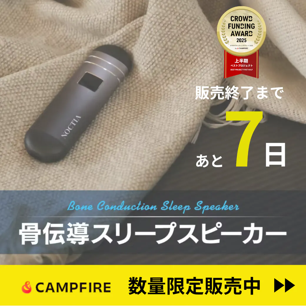 いつも応援いただき、誠にありがとうございます。骨伝導スリープスピーカーのプロジェクトも、いよいよ終了まで残り7日となりました。プロジェクトはこちら▶▶▶ここまで多くの方にご支援いただき、「もっと早く知りたかった」「毎日使っています」といったお声も届いています。骨伝導だからこそ、耳をふさがず、自...