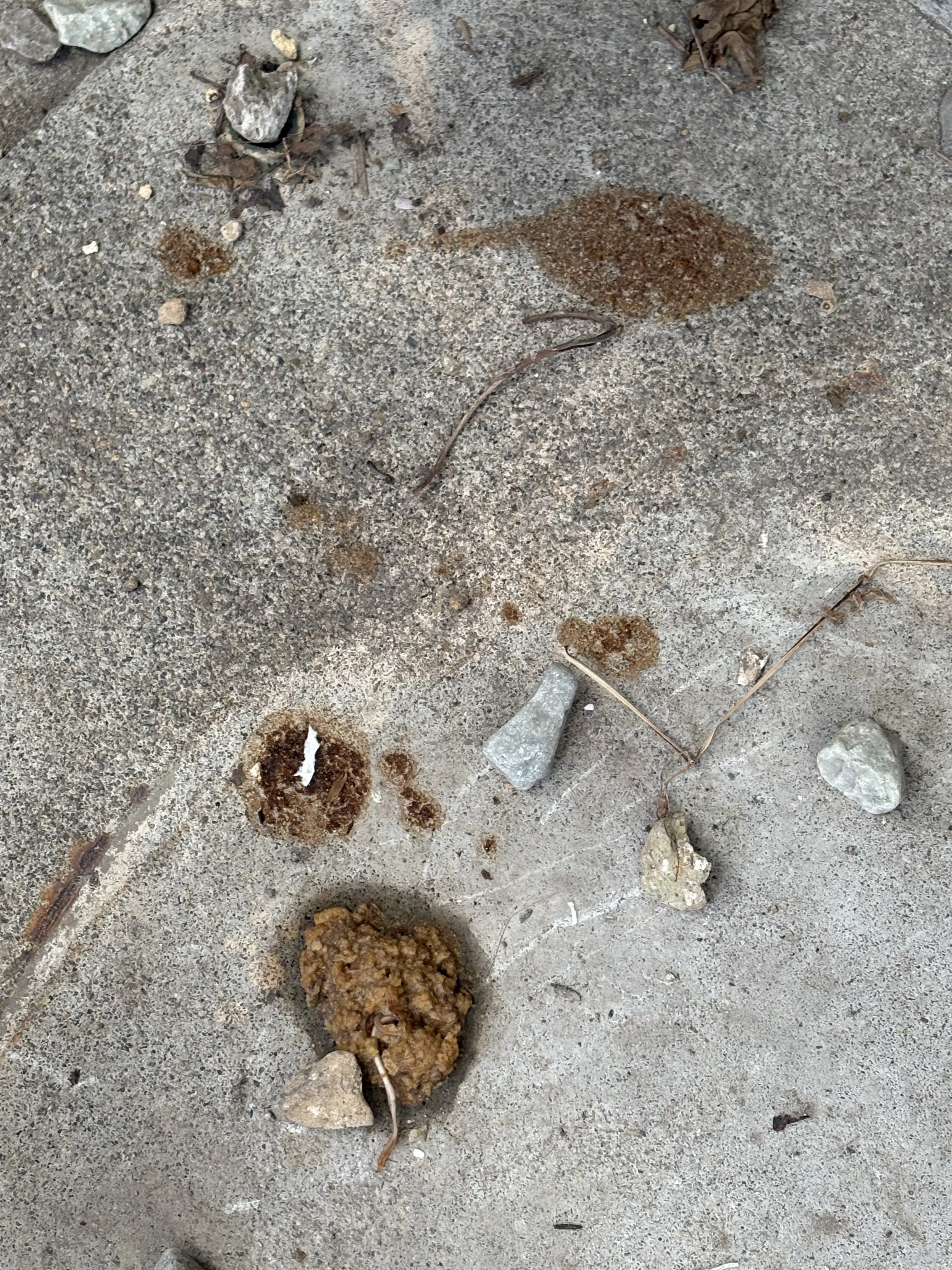 今朝、吐瀉物発見しました。朝ごはんの時に1頭だけ現れない子がいました。単なる消化不良だといいのですが…。私が見てない時に、ご飯を食べに来てくれているといいのですが…。これまでに、何度か毒殺があったので非常に心配です。その子の寝床には食べてすぐに吐いたと思われるフードがありました。(念のため、吐...