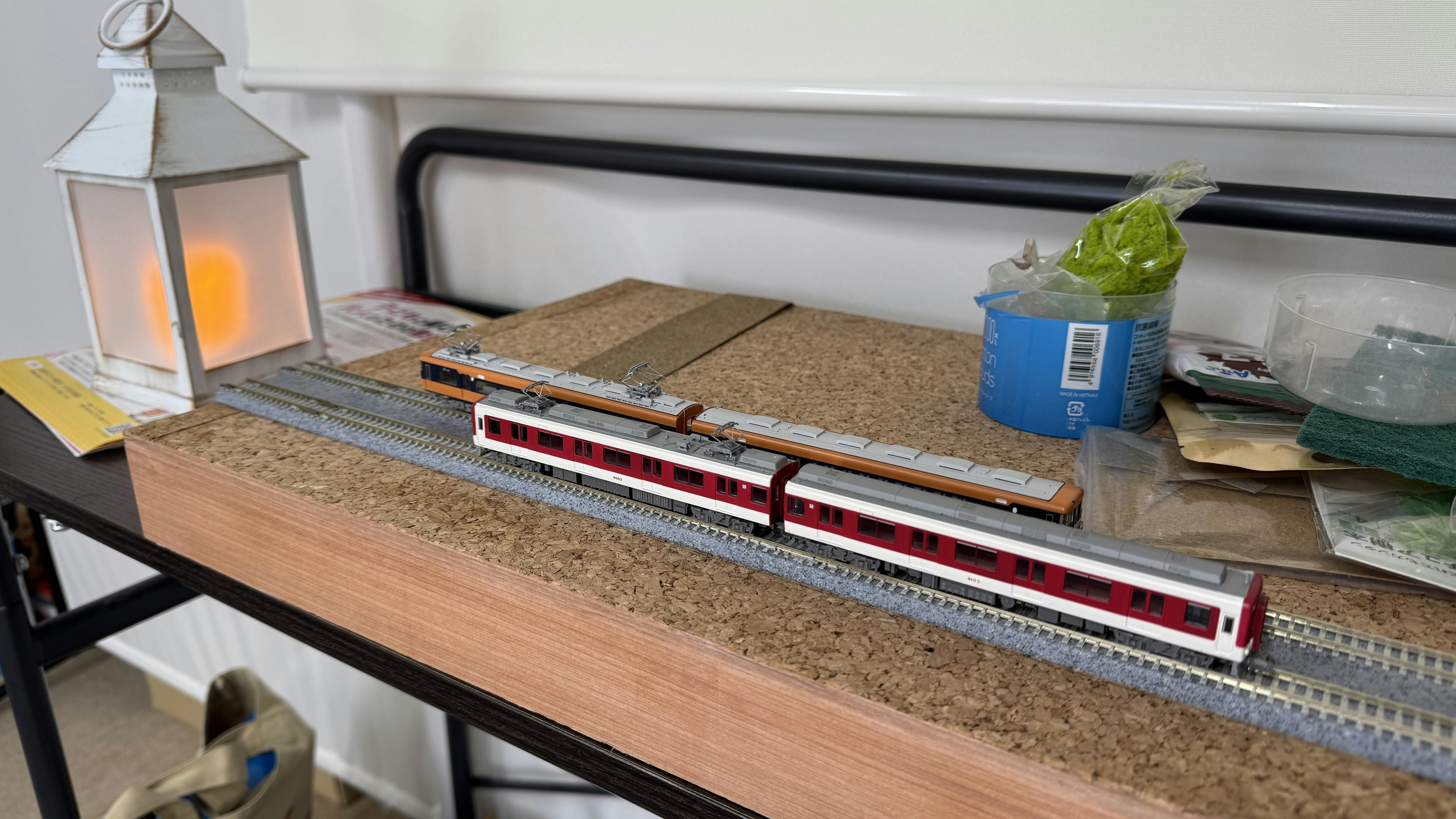 ご協力ありがとうございます。さっそく、線路の上に電車を置いてみました。私の自宅にあったコレクションの中から、数両を持ってきて、代喜さんからご寄付いただいたボードの上に並べてみました。並んでいるのは、近鉄12200系 新スナックカーと、近鉄9000系の通勤電車です。時代的には、実際に同じ時期に走...