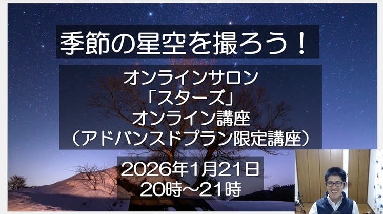 【昨夜のオンライン講座、ありがとうございました】昨夜は、オンラインサロン「スターズ」アドバンスドプラン向けのオンライン講座を開催しました^^ご参加くださった皆さま、本当にありがとうございました!2026年最初の講座では、今年ぜひ撮ってほしい☆「天の川」☆「星空風景」について、 撮りやすいシーズ...