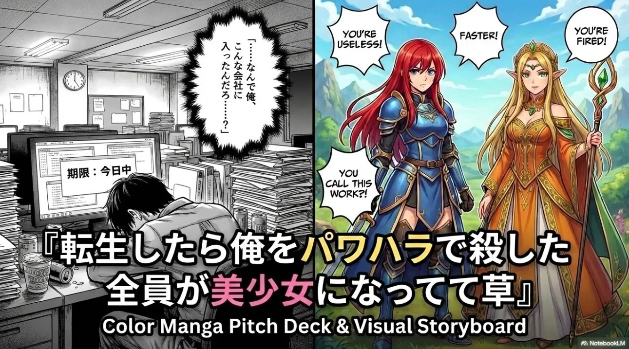 AI制作ツールを活用し、新作AI漫画『転生したら俺をパワハラで殺した全員が美少女になってて草』を制作中です。1P〜18Pあらすじ(簡潔まとめ)主人公・ユウトはブラック企業でパワハラを受け続け、ついに過労死。転生特典として“復讐に特化した闇魔法《リベンジコード》”を授かり異世界へ。草原で目覚めた...