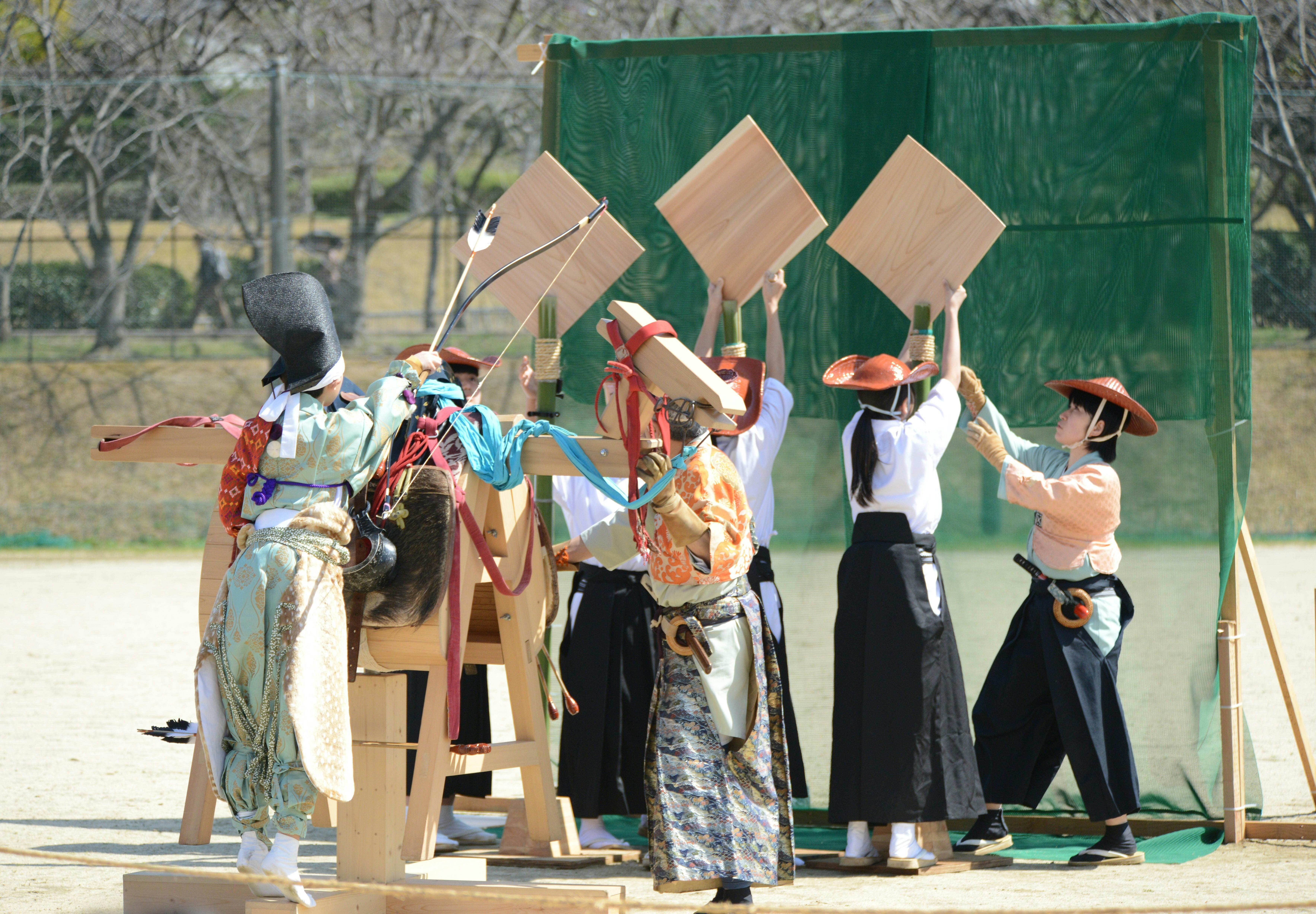 第2回流鏑馬まつり、子ども流鏑馬木馬披露の一場面です。射手が交代する合間に、OGの子どもたちが先生の指導のもと、的を整えています。このあと、木馬に乗った射手が「陰陽(いんよう)」の掛け声とともに矢を放ちます。一瞬の動きの裏には、射手だけでなく、的を支える仲間や指導する先生方の存在があります。多...