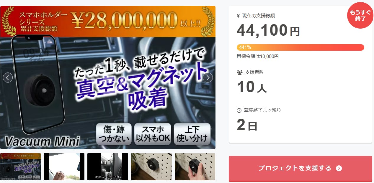 ご支援者様、車内やキッチン、どんな場所でもスマホが固定できる!真空&磁気吸着式スマホホルダーにご興味をお持ちいただきありがとうございます。お陰様で、開始から支援総額4万円達成することができました!終了までわずか 2 日となります。<片側が真空吸着、もう片側がマグネットで強力に固定され、平...