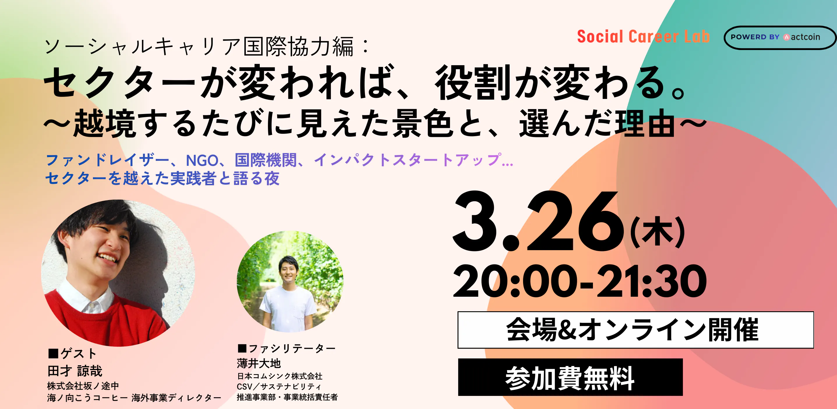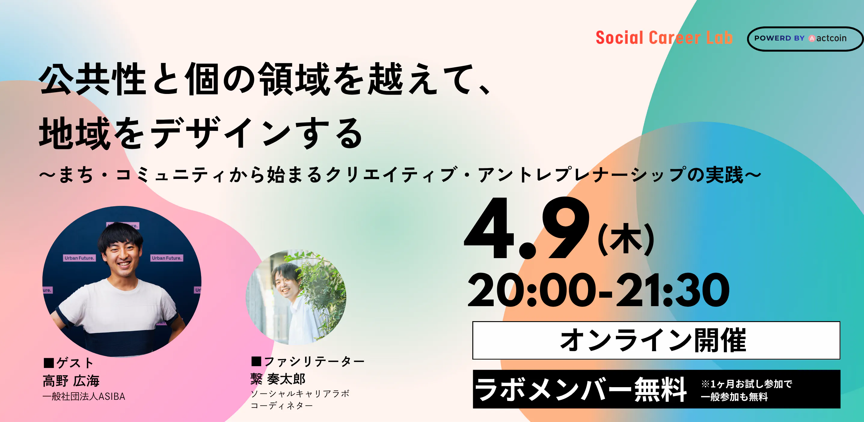 【4/9(木)オンライン|公共性と個の領域を越える「クリエイティブ・アントレプレナーシップ」とは?】建築、デザイン、アート、まちづくり、そして社会課題解決。本来は地続きであるはずのこれらの領域が、キャリアの文脈では「別々の道」として扱われてきた、そんな違和感から生まれた実践を掘り下げるイベント...