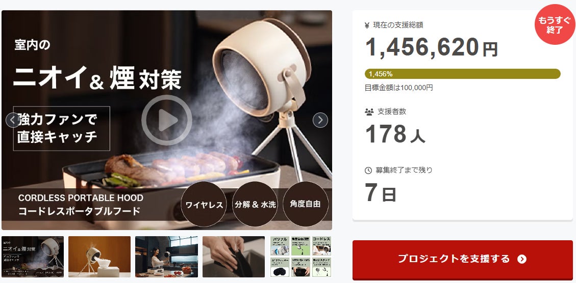 ご支援者 様、煙・油・ニオイを瞬時に強力吸収する場所を選ばないコードレス換気扇にご興味をお持ちいただきありがとうございます。お陰様で、開始から支援総額140万円達成することができました!終了までわずか 7 日となります。小洒落たサーキュレーターのような風貌ですが、中身はしっかりとしたレンジフー...