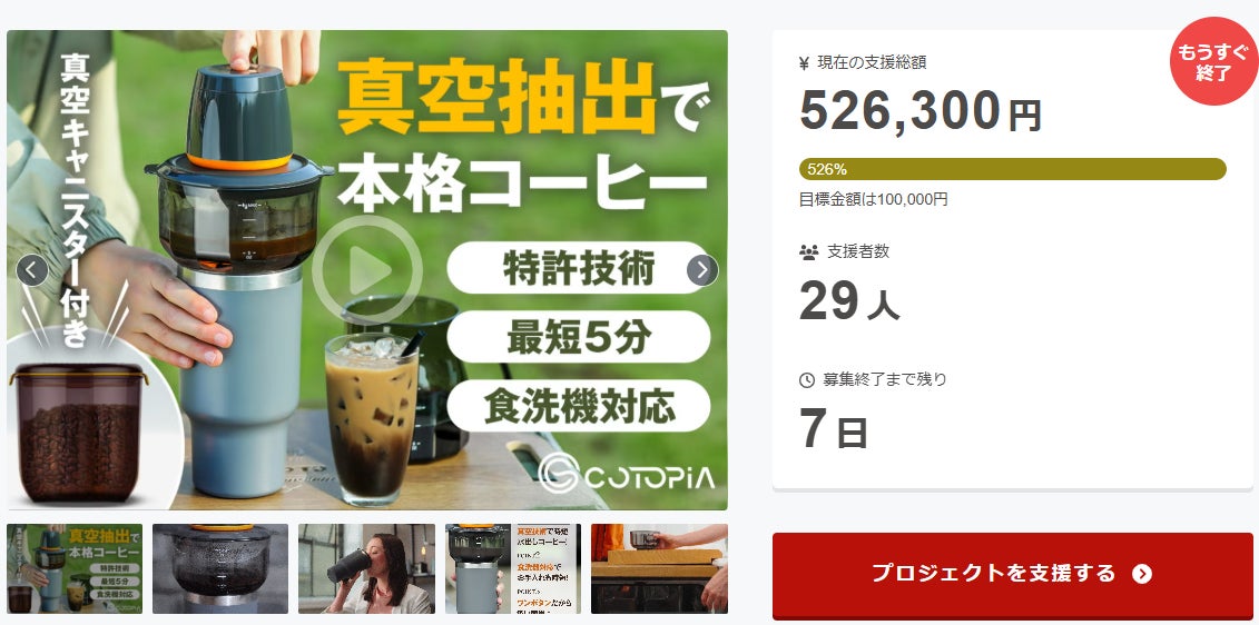 ご支援者 様、特許技術で深い味わいを最短5分で実現。真空抽出コーヒーメーカー+密封キャニスターにご興味をお持ちいただきありがとうございます。お陰様で、開始から支援総額52万円達成することができました!終了までわずか 7 日となります。時間を計ってみるとちょうど5分で下に押し出されていきました。...