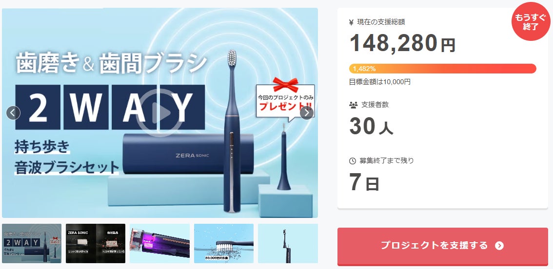 ご支援者 様、UVクリーナーとマイクロファンでいつでも新品同様衛生的!2Way音波ブラシセットにご興味をお持ちいただきありがとうございます。お陰様で、開始から支援総額14万円達成することができました!終了までわずか 7 日となります。ZERA SONIC歯ブラシは、歯ブラシと歯間ブラシを一体化...